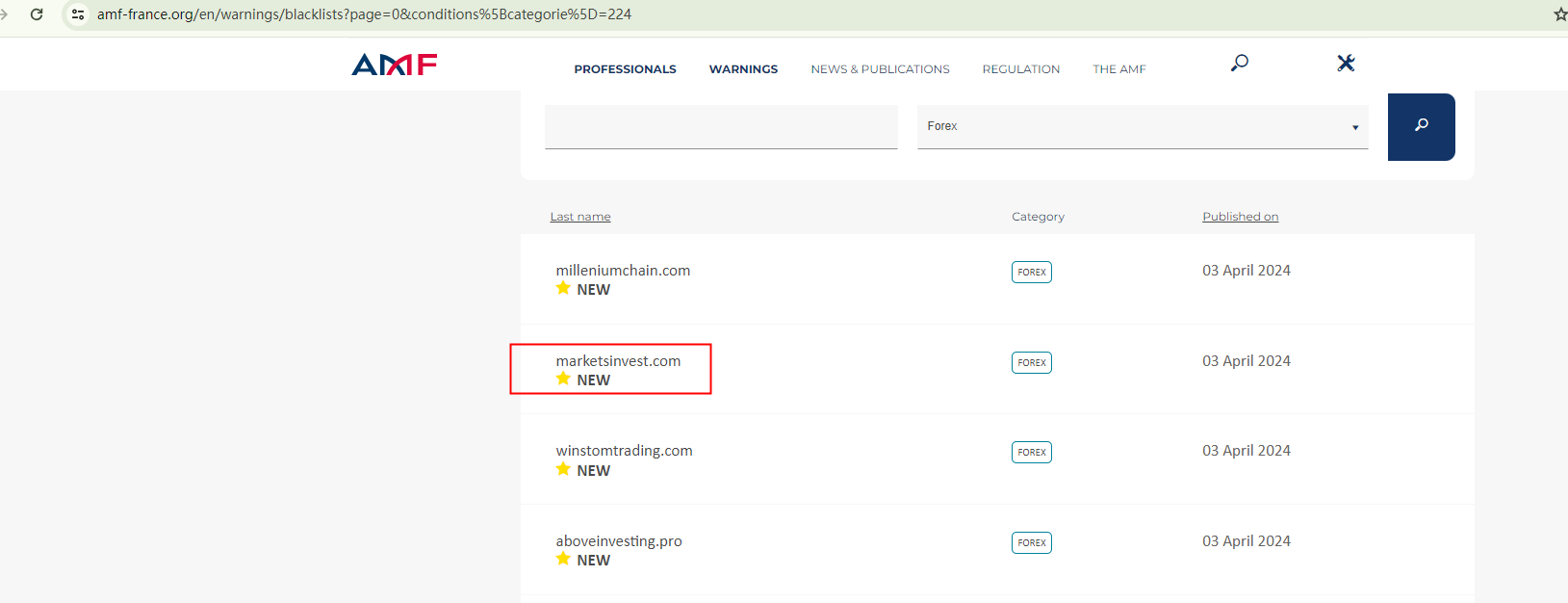 On April 3, 2024, the Financial Authority (Autorité des Marchés Financiers, AMF) added Marketsinvest to warning list for it being an unauthorized company engaging in forex activities. https://www.amf-france.org/en/warnings/blacklists?page=0&conditions%5Bcategorie%5D=224