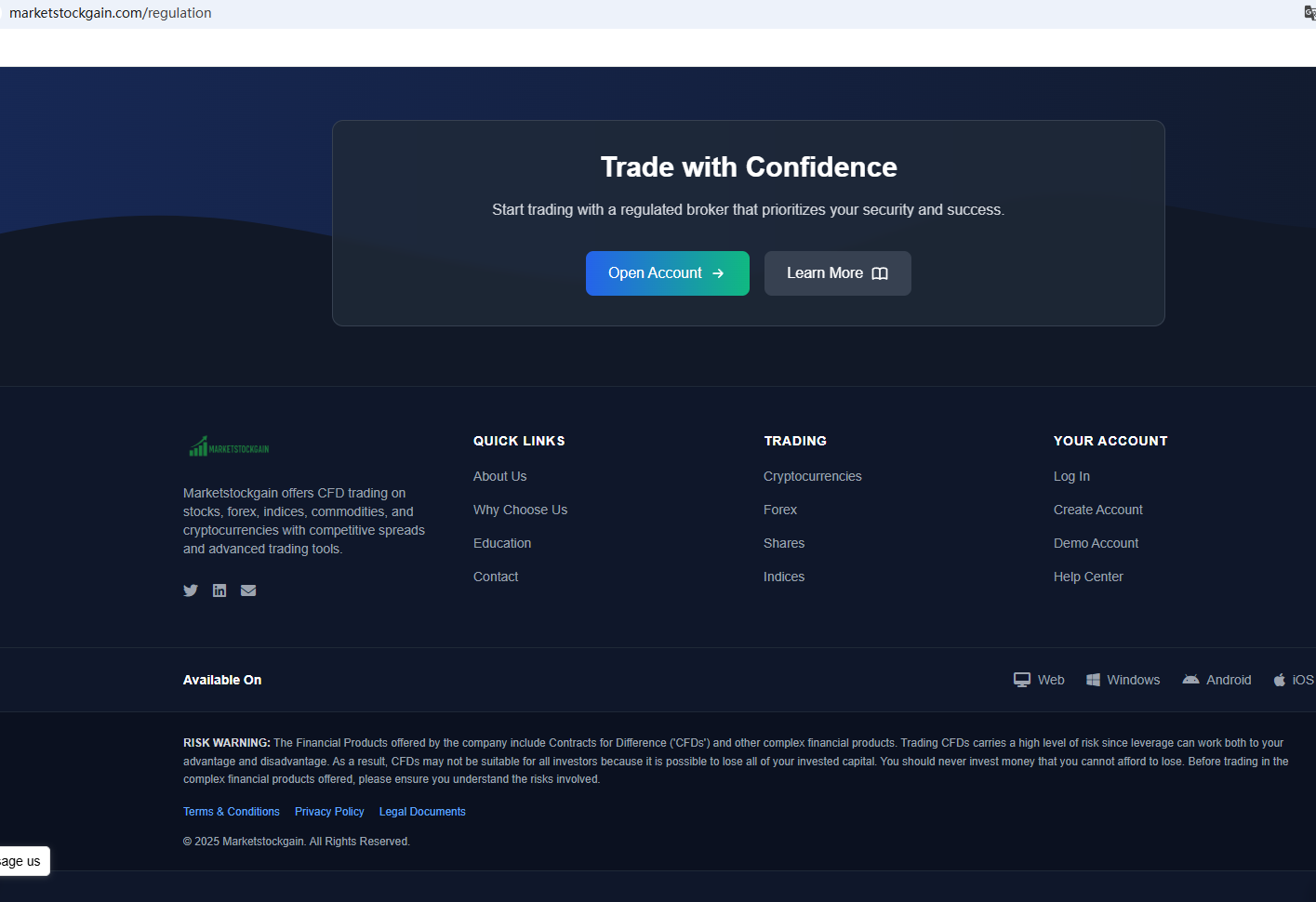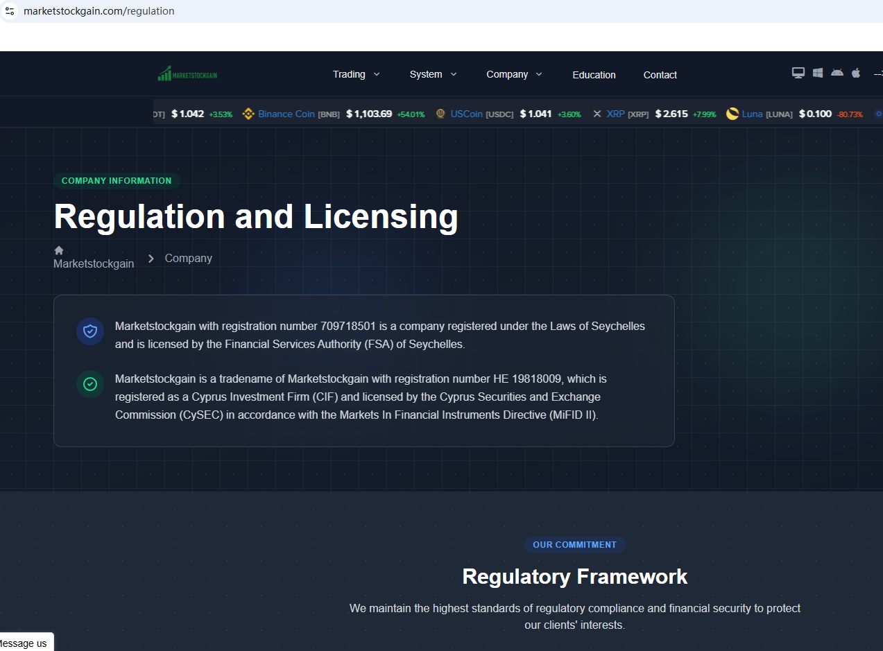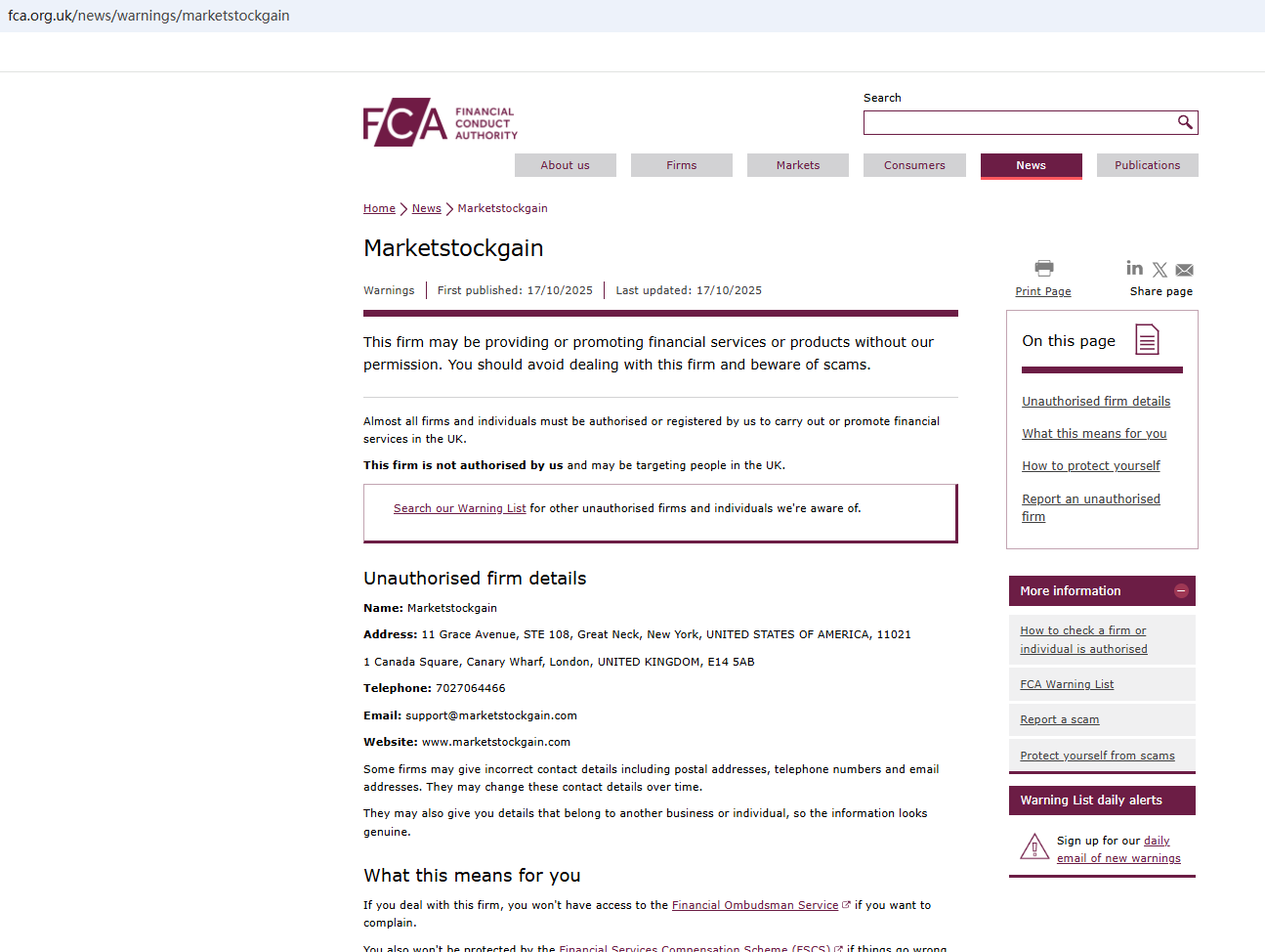 According to its website, it claims to be regulated by the Seychelles Financial Services Authority (Seychelles FSA) and the Cyprus Securities and Exchange Commission (CySEC). Upon investigation, no matching information was found in the Seychelles FSA and CySEC. In addition, the Financial Conduct Authority (FCA) issued a warning regarding Marketstockgain, suspecting that this company may be offering financial services or products without the necessary authorization.