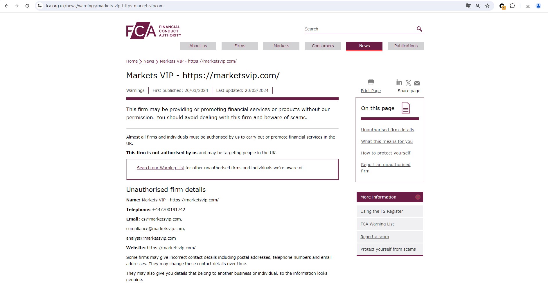 And the FCA issued a warning that Markets VIP was providing financial services or products in the UK without authorisation.