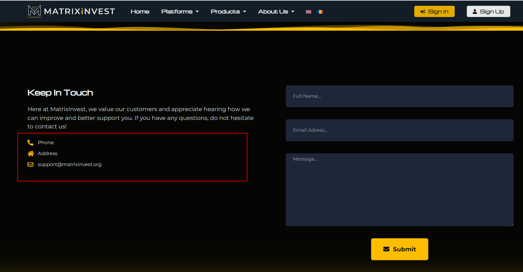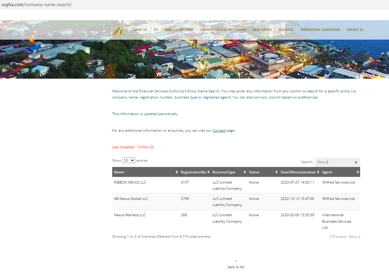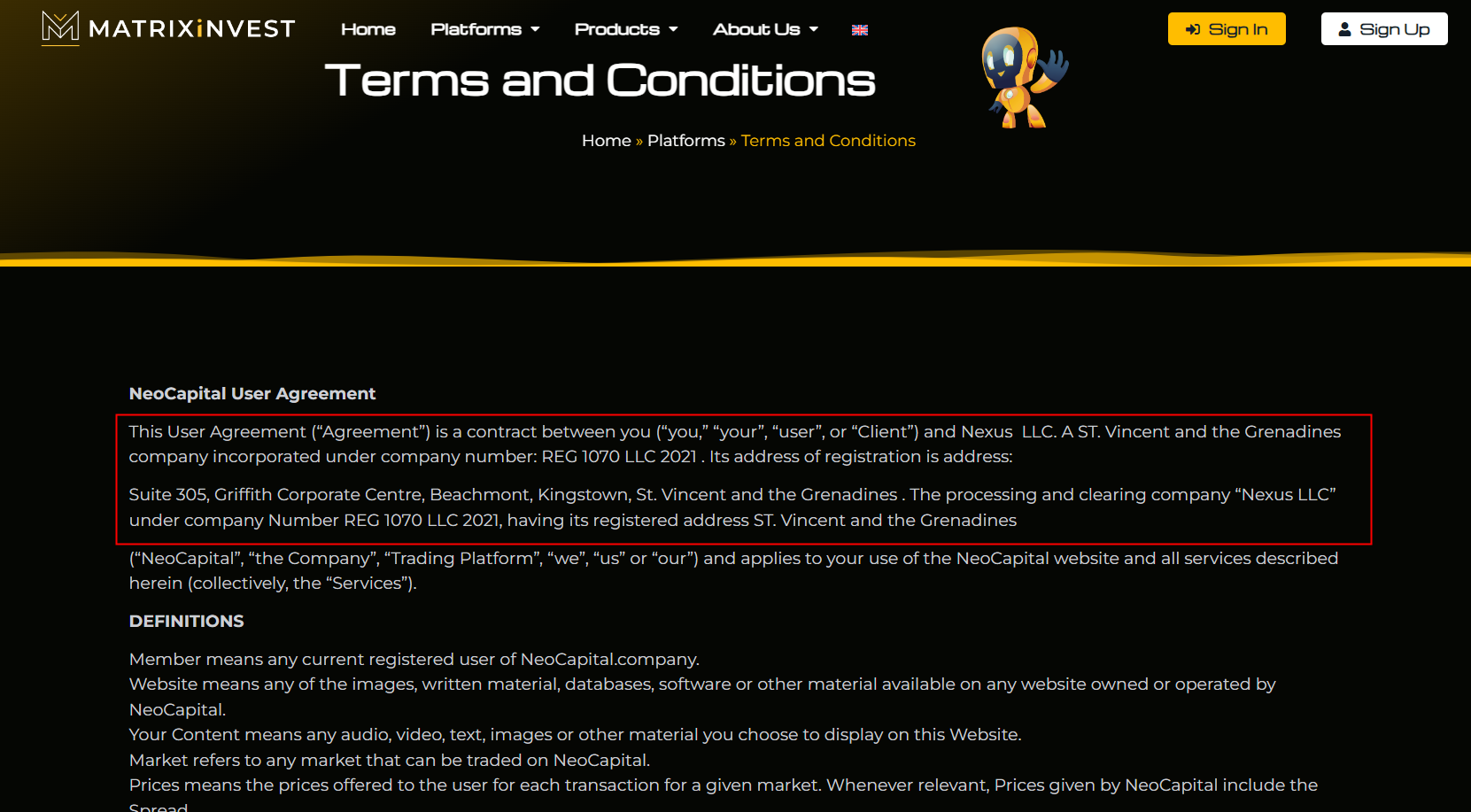 As per their website, there are no relevant regulatory updates displayed on the homepage. However, it is peculiar that the Terms and Conditions mentions a company called NEXUS LLC, which is supposedly registered in St. Vincent. On further investigation, we could not find any relevant records to validate this claim. Additionally, there is no evidence to prove that the brand MatrixInvest is associated with NEXUS LLC. The connection between the two entities is unclear.