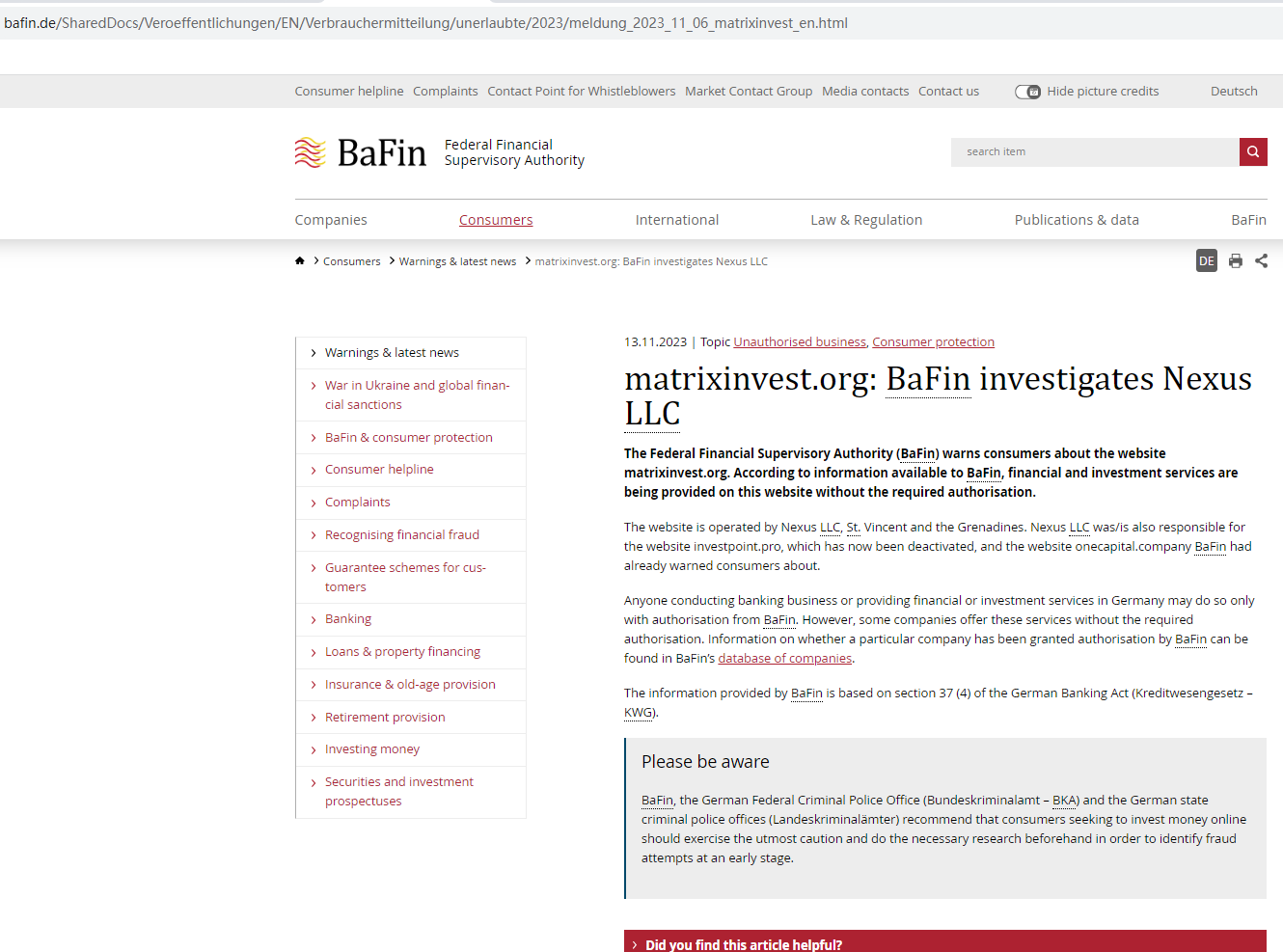 On 13 November 2023, the Federal Financial Supervisory Authority (BaFin) issued a warning that MatrixInvest was providing financial services or products without authorization. You may visit: https://www.bafin.de/SharedDocs/Veroeffentlichungen/EN/Verbrauchermitteilung/unerlaubte/2023/meldung_2023_11_06_matrixinvest_en.html