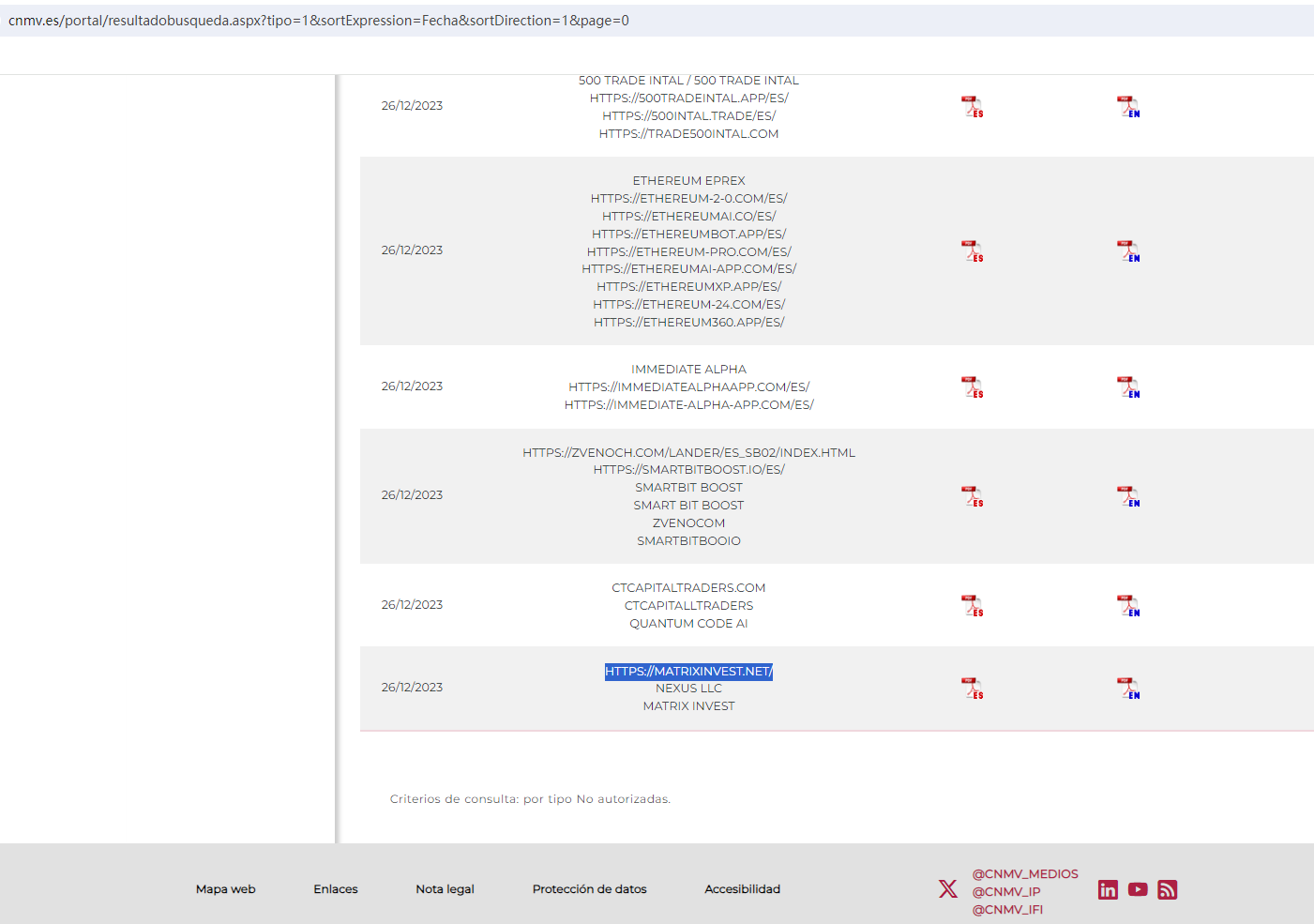 On 26 December2023, the Comisión Nacional del Mercado de Valores (CNMV) issued a warning that MATRIX INVEST was providing financial services or products without authorisation and add the domain name used by the scam. You may visit: https://www.cnmv.es/portal/resultadobusqueda.aspx?tipo=1&sortExpression=Fecha&sortDirection=1&page=0