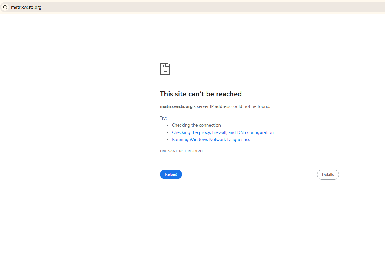 BrokersView found that the domain "https://matrixvests.org/" is currently inaccessible. This is widely regarded as a significant red flag, as the suspension of a broker's website often points to underlying regulatory or operational issues.