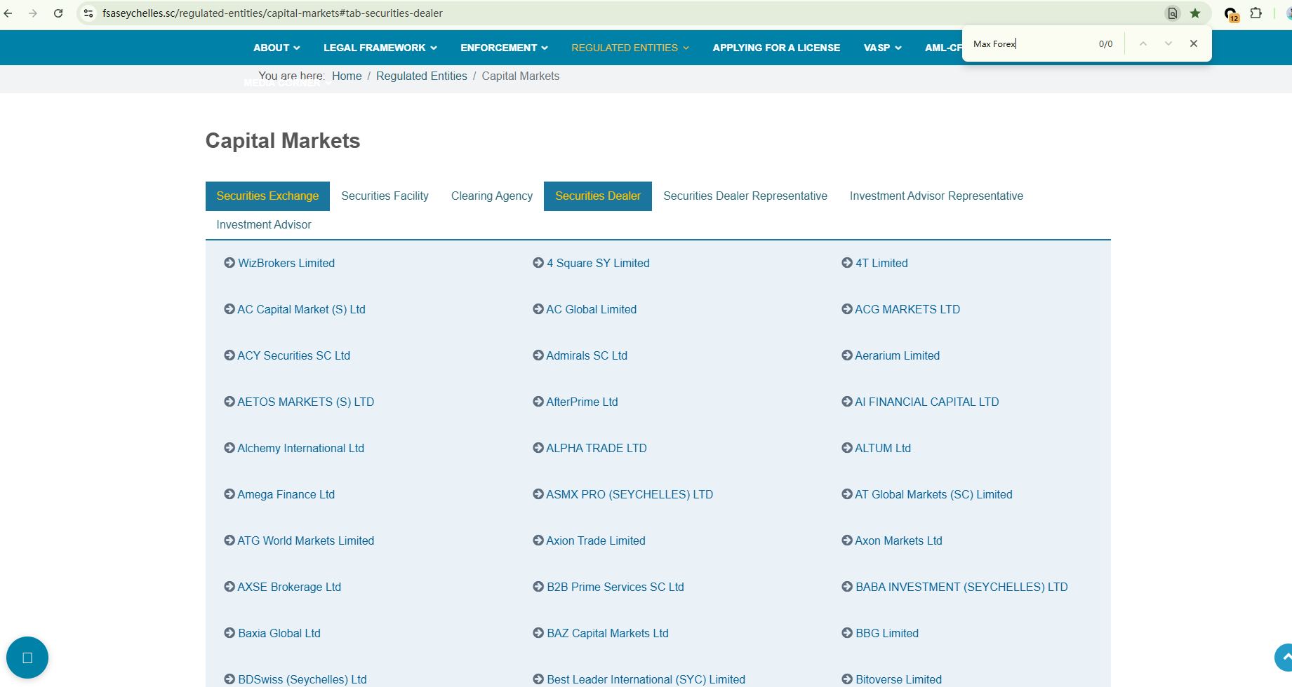Max Forex Trade initially claims that its entity, Max-Forex Trade Limited, is regulated by the Seychelles Financial Services Authority (FSA) under license number SD001. However, our search of the Seychelles FSA’s official register did not reveal any entity by that name under the specified license.