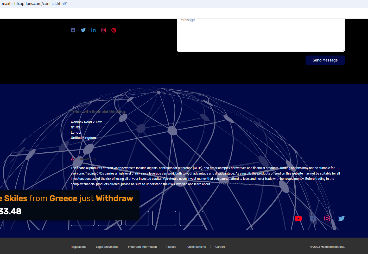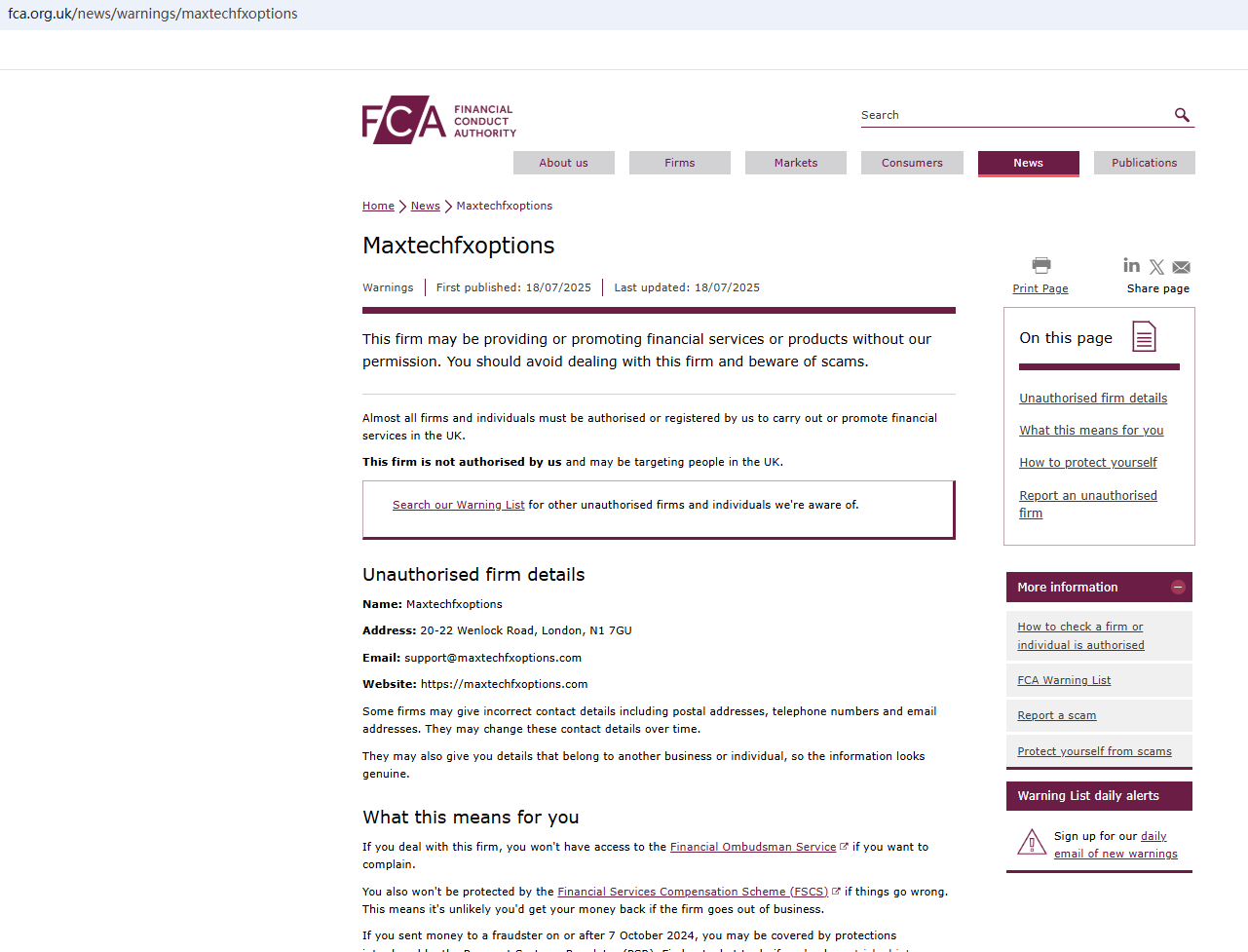 This company uses a common template for scam websites and has been flagged by Brokersview many times before. Such websites usually have similar web design and wording. The company is located in the UK, and we found that the Financial Conduct Authority (FCA) issued a warning against Maxtechfxoptions, believing this company might be providing financial services or products without proper authorization in the UK.