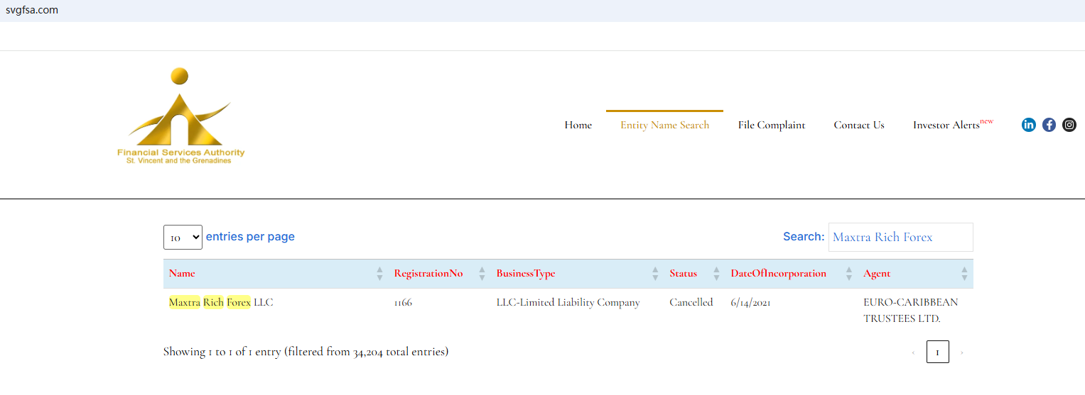 The website of Maxtra Rich is currently unavailable. The claimed registration with the Financial Services Authority of St. Vincent and The Grenadines (SVG FSA) has been canceled as well. All the signs indicate substantial risks of Maxtra Rich. Investors should be informed about the development and stay clear of it.