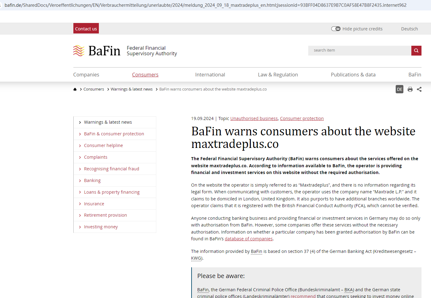 In addition, the Federal Financial Supervisory Authority (BaFin) warned consumers about the services offered by the company MAXTRADEPLUS (maxtradeplus.co), which is offering financial and investment services without the required authorization.