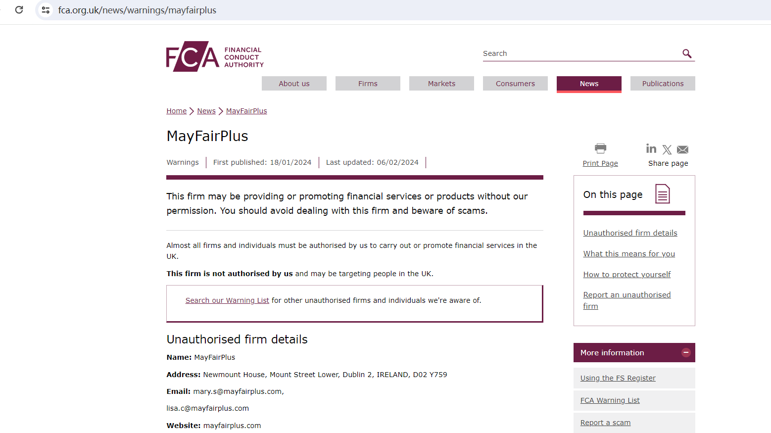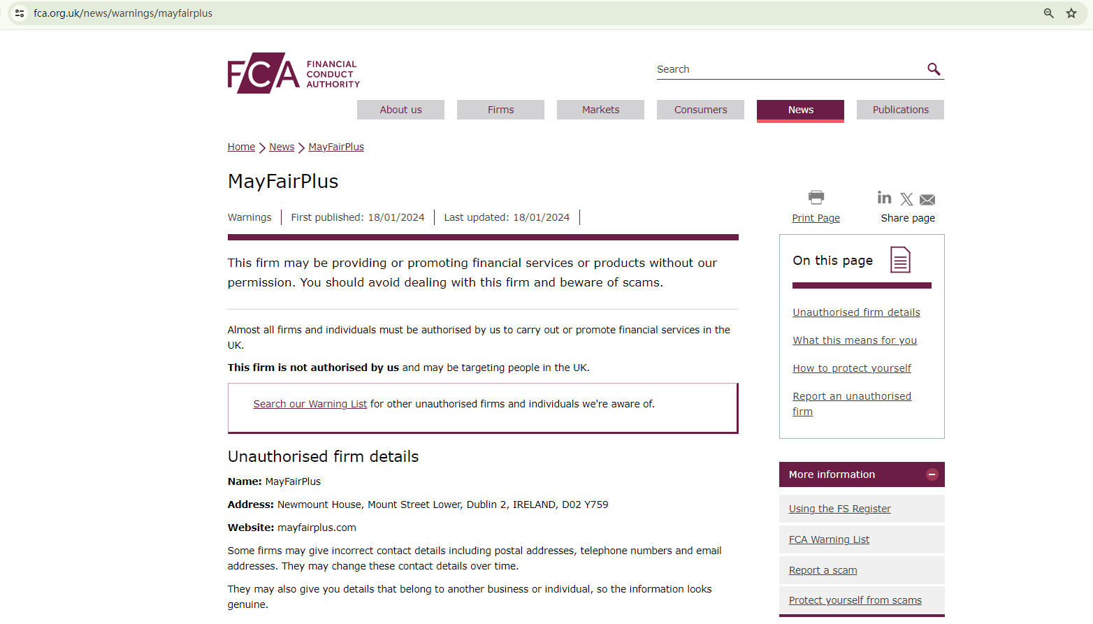 What's more, its unlicensed provision of financial services in the UK has elicited a warning from the Financial Conduct Authority (FCA), which identifies MayFairPlus as unauthorized.