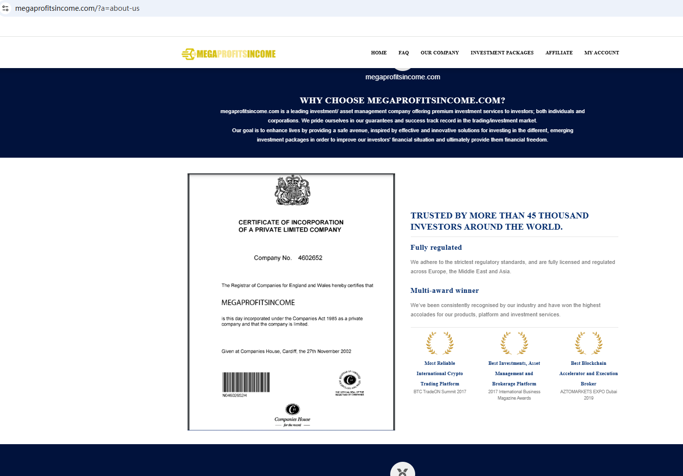 It claims to be a reliable company and displays a Certificate of Company House (CH) on its website. In reality, a CH is a legitimate company registration and does not have the authority to regulate foreign exchange. Farmers in the UK are required to obtain unlicensed foreign exchange through the Financial Conduct Authority (FCA), despite the FCA issuing a warning regarding Mega Profits Income, suspecting that this company may be offering financial services or products without the necessary authorization.