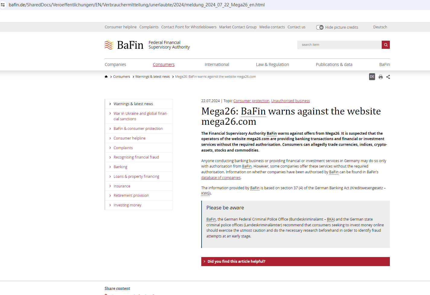In addition, the Federal Financial Supervisory Authority (BaFin) warned consumers about the services offered on the website mega26.com for lacking the required authorization.