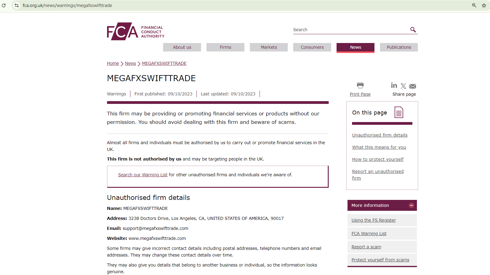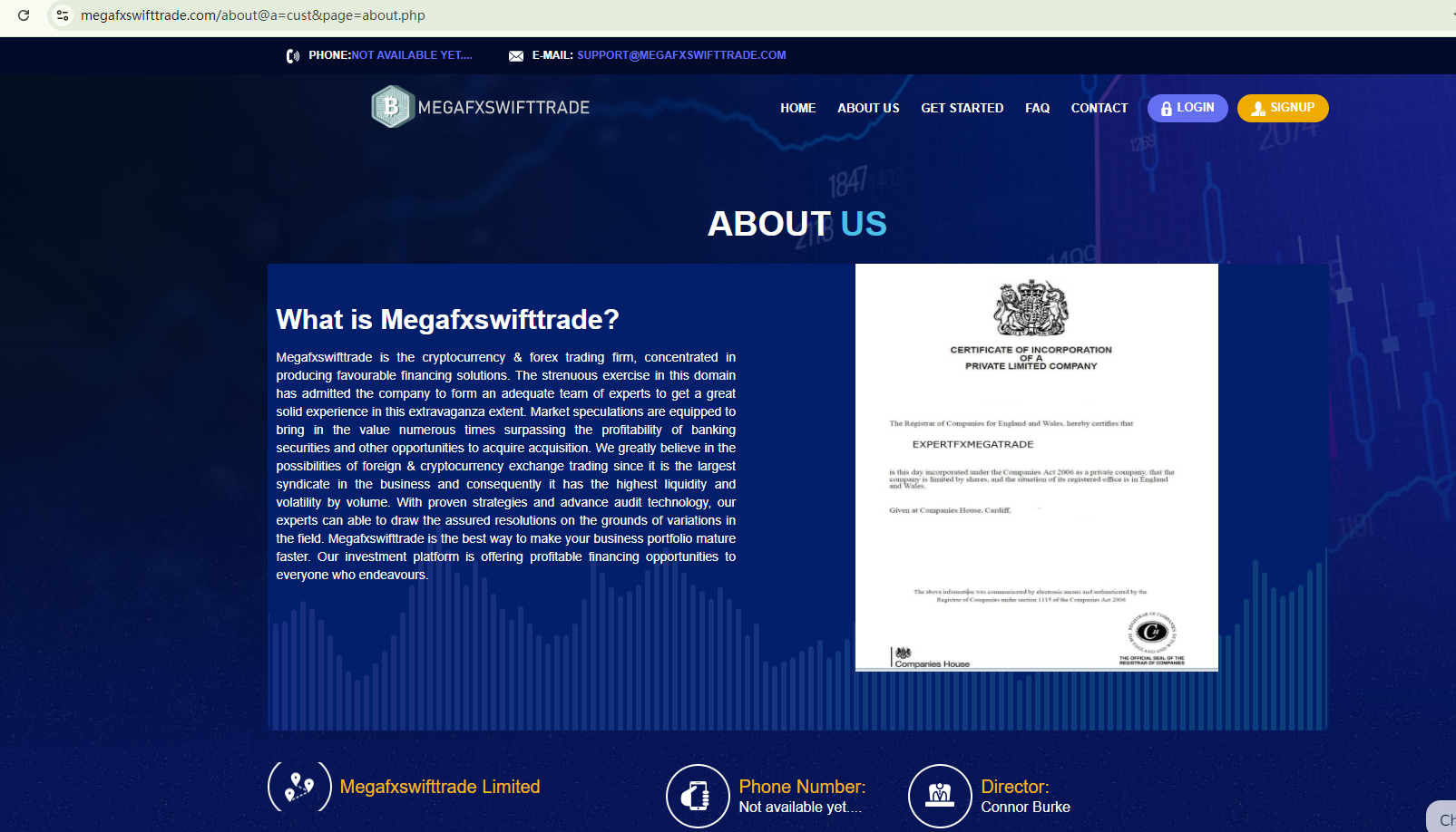 On the one hand, the business certificate from the Companies House (CH) Megafxswifttrade claims to have is fake. On the other hand, the UK's financial Conduct Authority (FCA) has flagged Megafxswifttrade as an unauthorized firm in the UK.