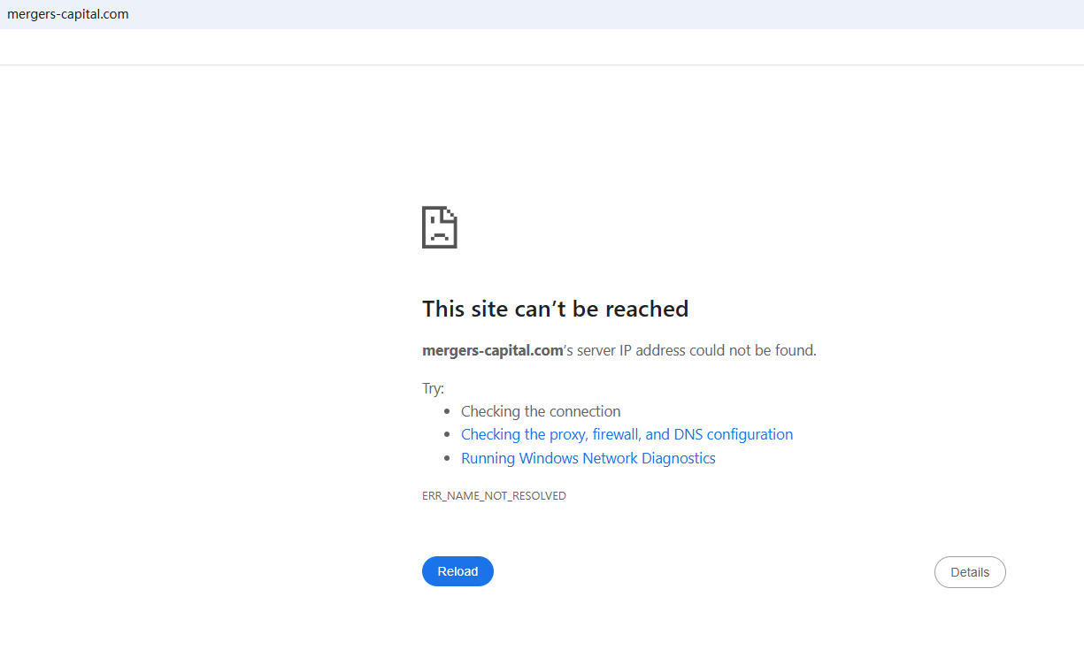 BrokersView found that the domain "https://mergers-capital.com/" is currently inaccessible. This is widely regarded as a significant red flag, as the suspension of a broker's website often points to underlying regulatory or operational issues.