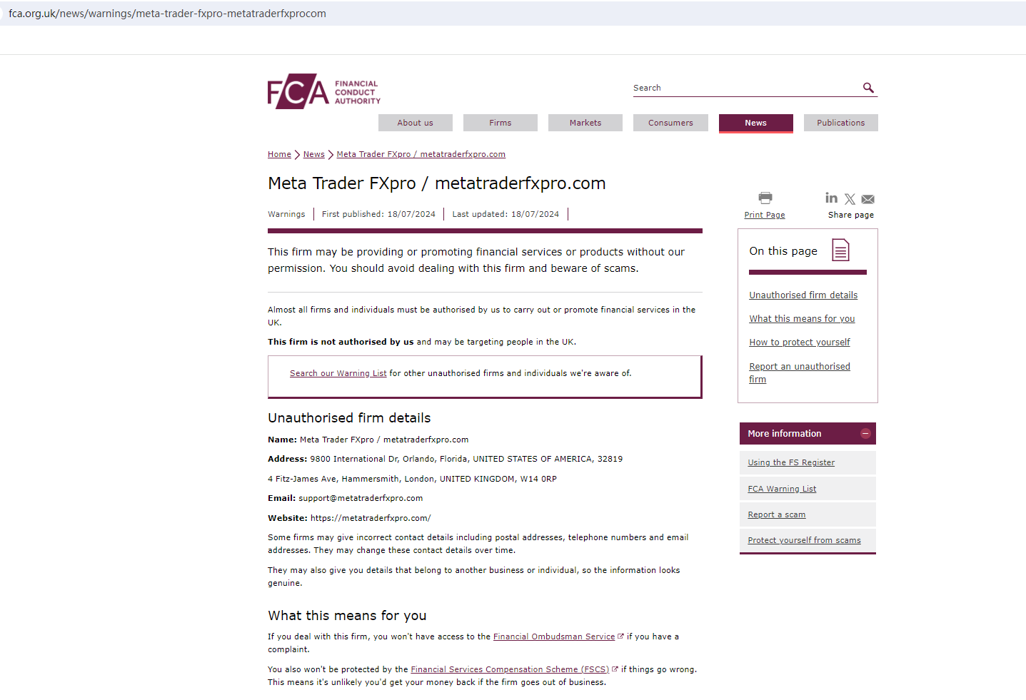 On July 18, 2024, the Financial Conduct Authority (FCA) issued a warning against Meta Trader FXpro, believing this company might be providing financial services or products without proper authorization in the UK. https://www.fca.org.uk/news/warnings/meta-trader-fxpro-metatraderfxprocom