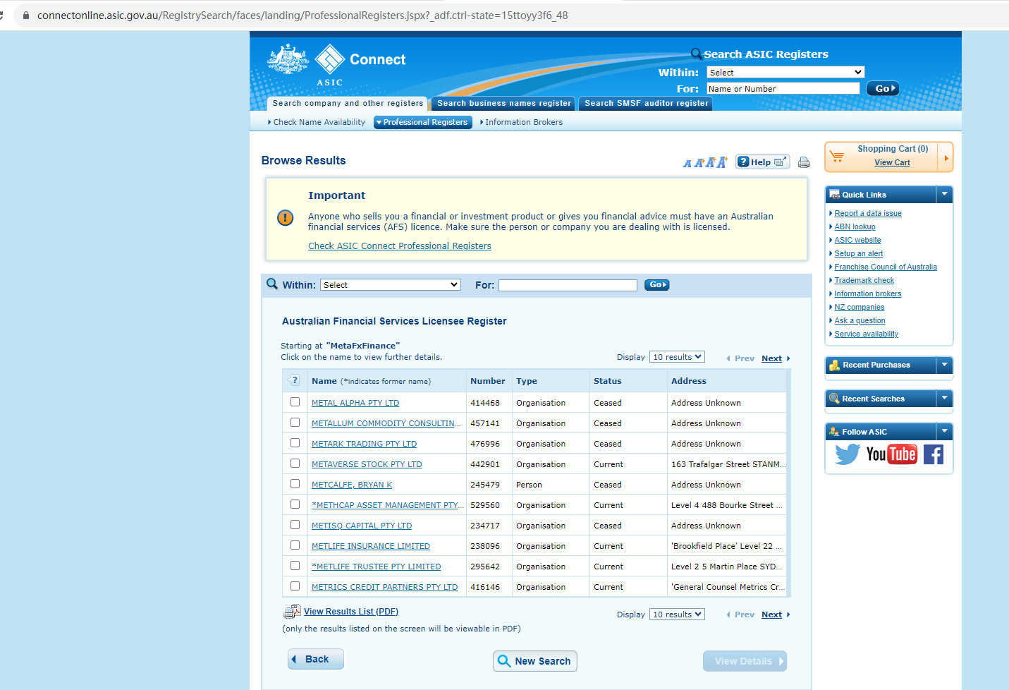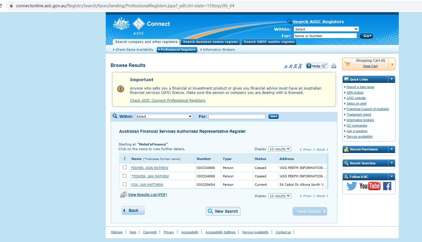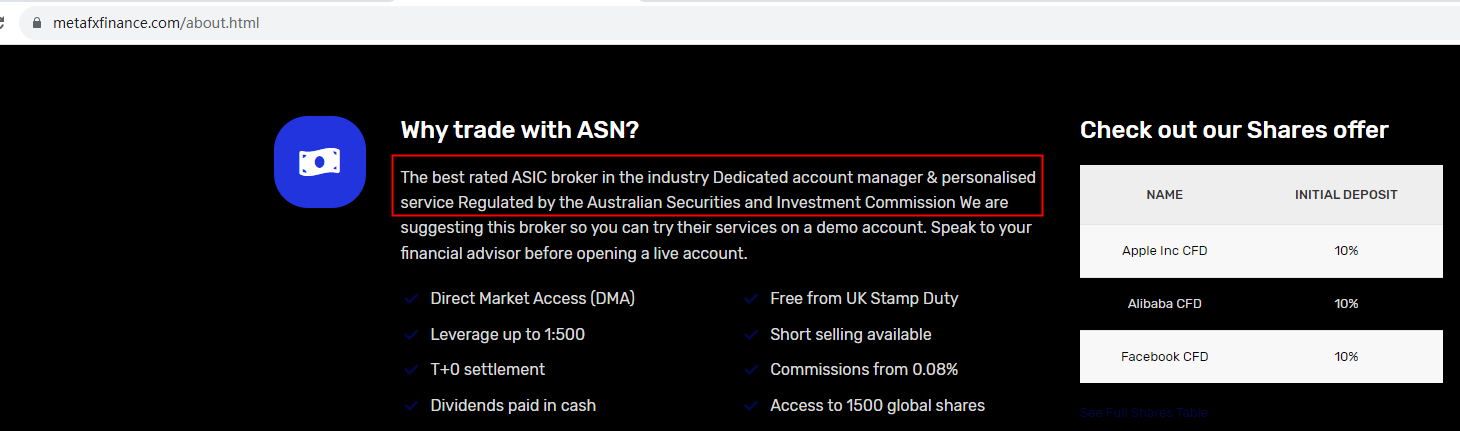 MetaFxFinance claims to be regulated by the Australian Securities and Investment Commission (ASIC), while we found no matching results on ASIC. It is a red flag.