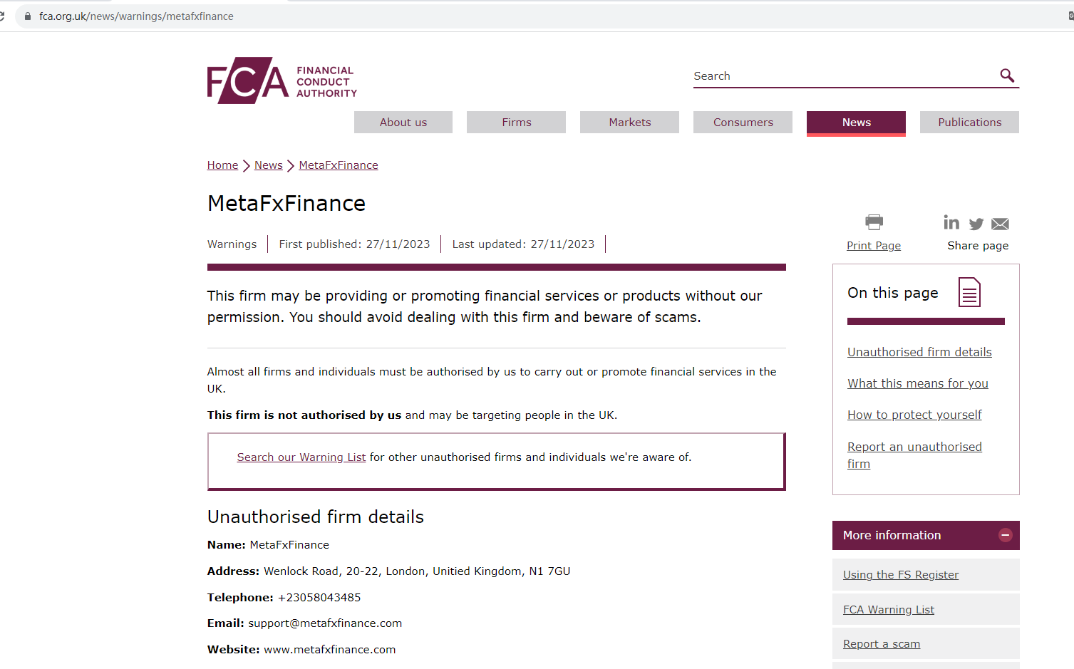 On 27 November 2023, the United Kingdom Financial Conduct Authority (UK FCA) issued a warning that MetaFxFinance was providing financial services or products in the UK without authorisation. You may visit: https://www.fca.org.uk/news/warnings/metafxfinance