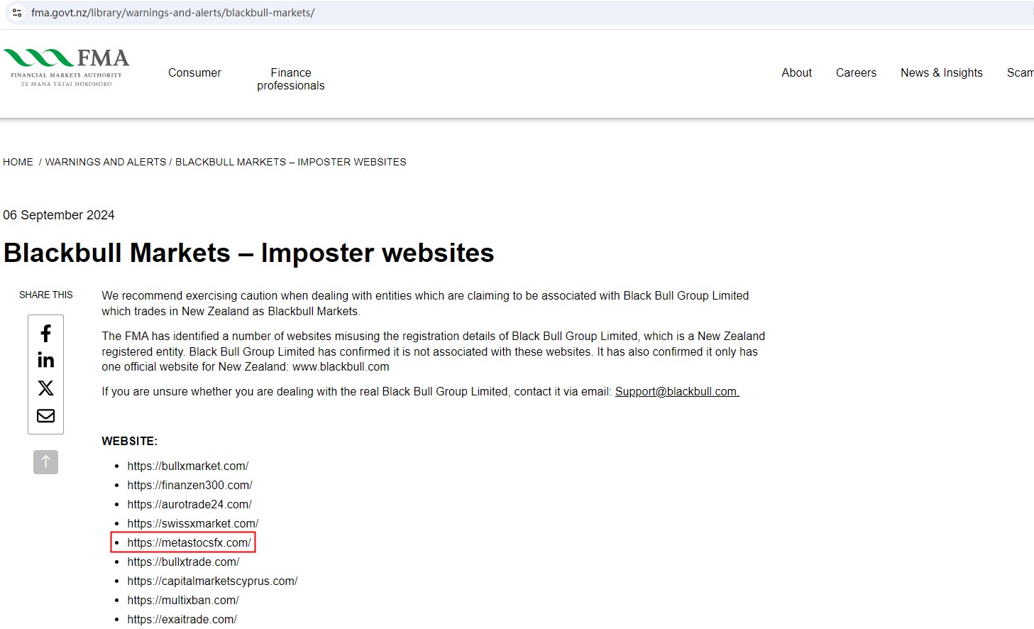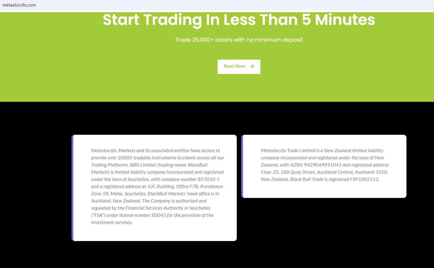 Metastocsfx falsely claims to be associated with Black Bull Group Limited, which operates in New Zealand as Blackbull Markets. The New Zealand Financial Markets Authority (NZ FMA) has identified several websites, including Metastocsfx, that misuse the registration details of Black Bull Group Limited, a registered entity in New Zealand. Black Bull Group Limited has confirmed it is not associated with these websites. Therefore, Metastocsfx is clearly a scam.