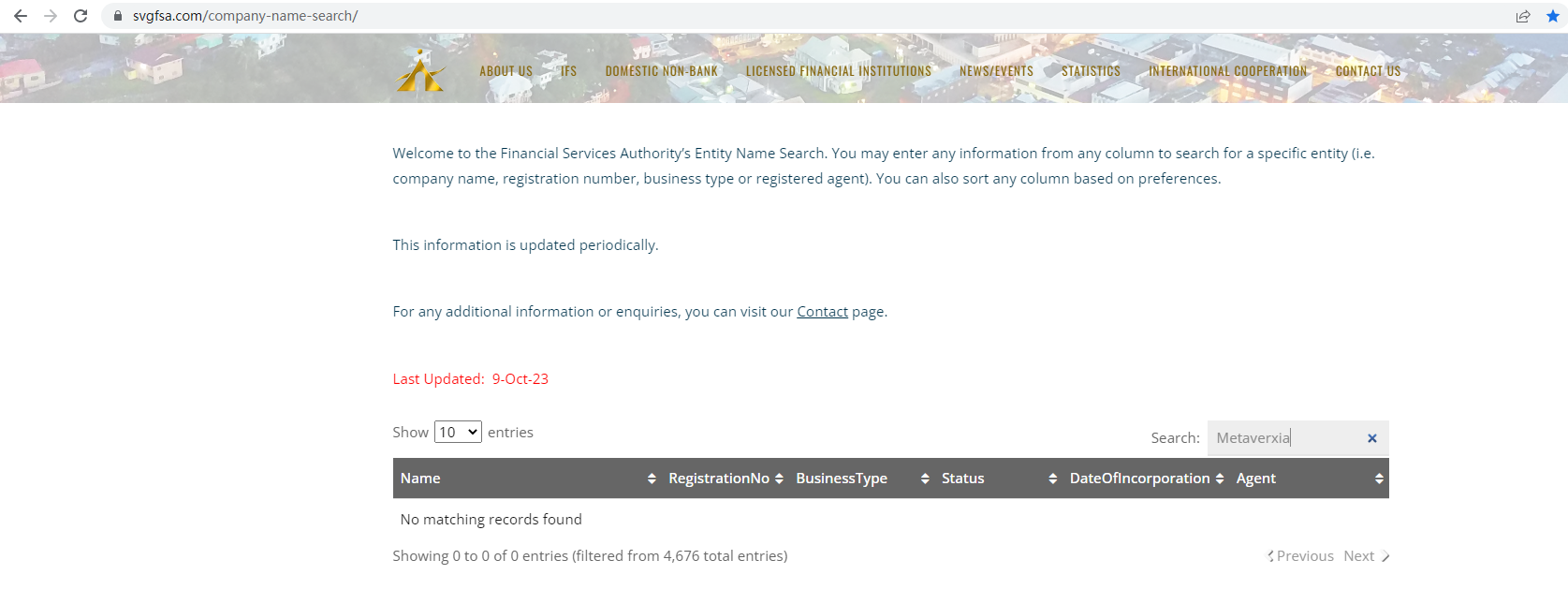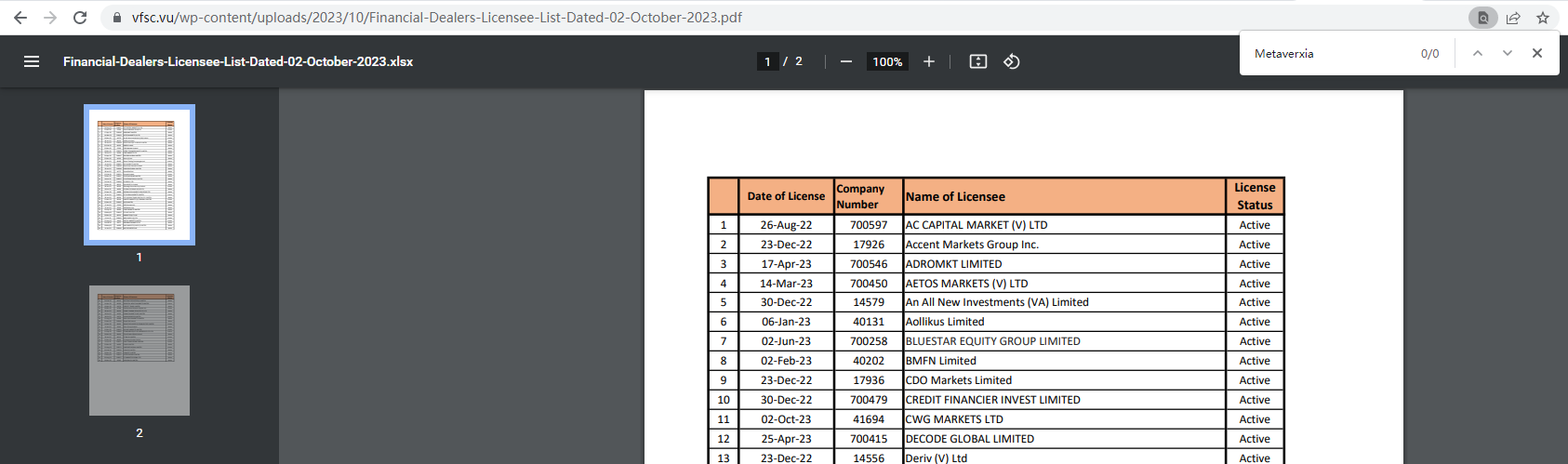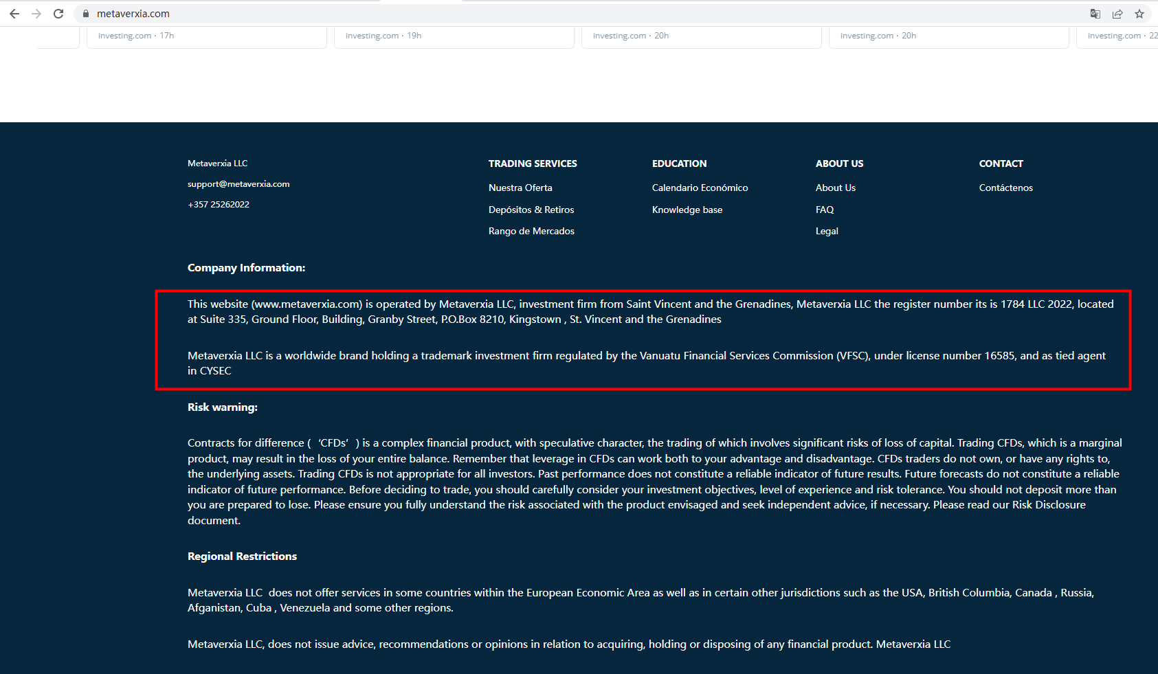 Metaverxia claims to be registered in Financial Services Authority (FSA) of Saint Vincent and the Grenadines and regulated by the Vanuatu Financial Services Commission (VFSC). But we don't find the correct information on FSA and VFSC matching to Metaverxia or its license number. The truth is that Metaverxia is not under valid regulation by any regulators to do forex. Investors' funds in this broker are unsafe and cannot be protected by any law.