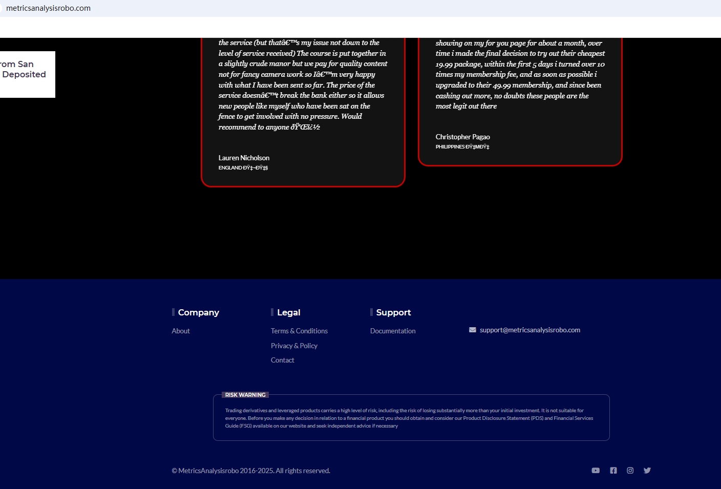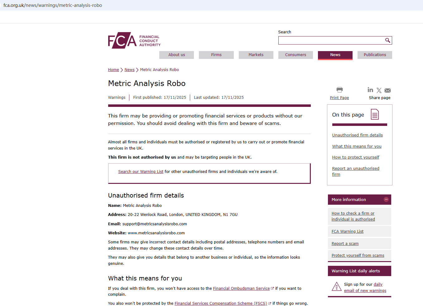 On November 17, 2025, the Financial Conduct Authority (FCA) issued a warning regarding Metric Analysis Robo, suspecting that this company may be offering financial services or products without the necessary authorization. https://www.fca.org.uk/news/warnings/metric-analysis-robo