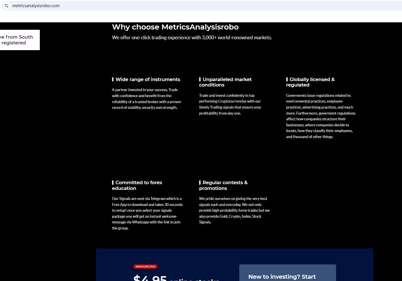 According to its website, the company claims to be a reliable, globally regulated firm. Firstly, a closer look reveals that the website uses a template commonly found on fraudulent sites and has been flagged multiple times by Brokersview. Secondly, while it displays some seemingly valid certificates, none of these certificates qualify it to regulate forex trading. Finally, the website does not display an office address, which is highly suspicious. More importantly, the Financial Conduct Authority (FCA) issued a warning regarding Metric Analysis Robo, suspecting that this company may be offering financial services or products without the necessary authorization.