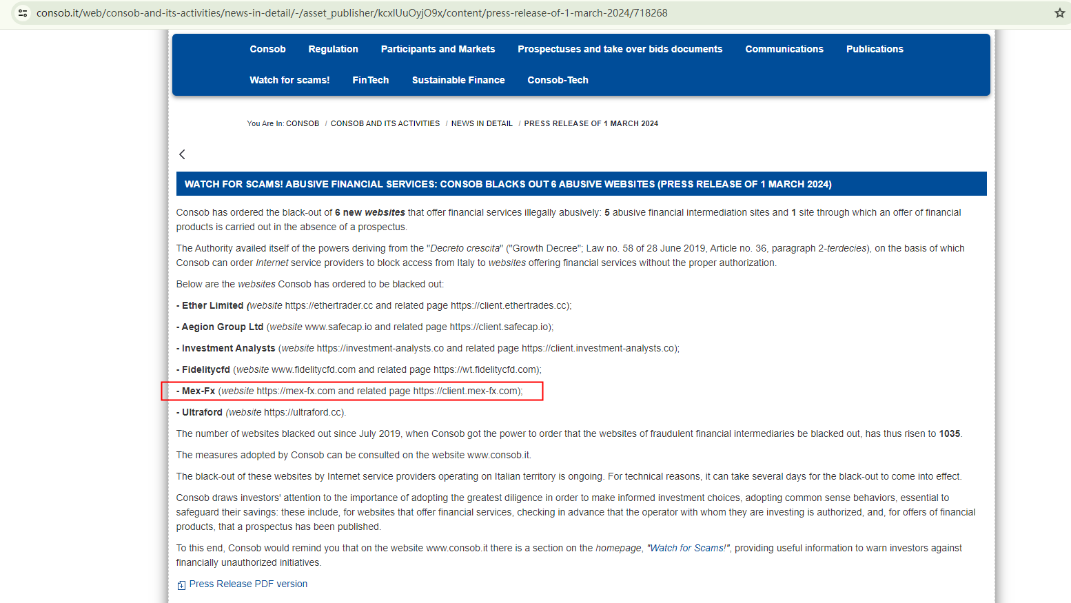 On March 1st, 2024, the Italian Companies and Exchange Commission (CONSOB) ordered Mex Fx's website to be blacked out since it offers financial services illegally in Italy. https://www.consob.it/web/consob-and-its-activities/news-in-detail/-/asset_publisher/kcxlUuOyjO9x/content/press-release-of-1-march-2024/718268
