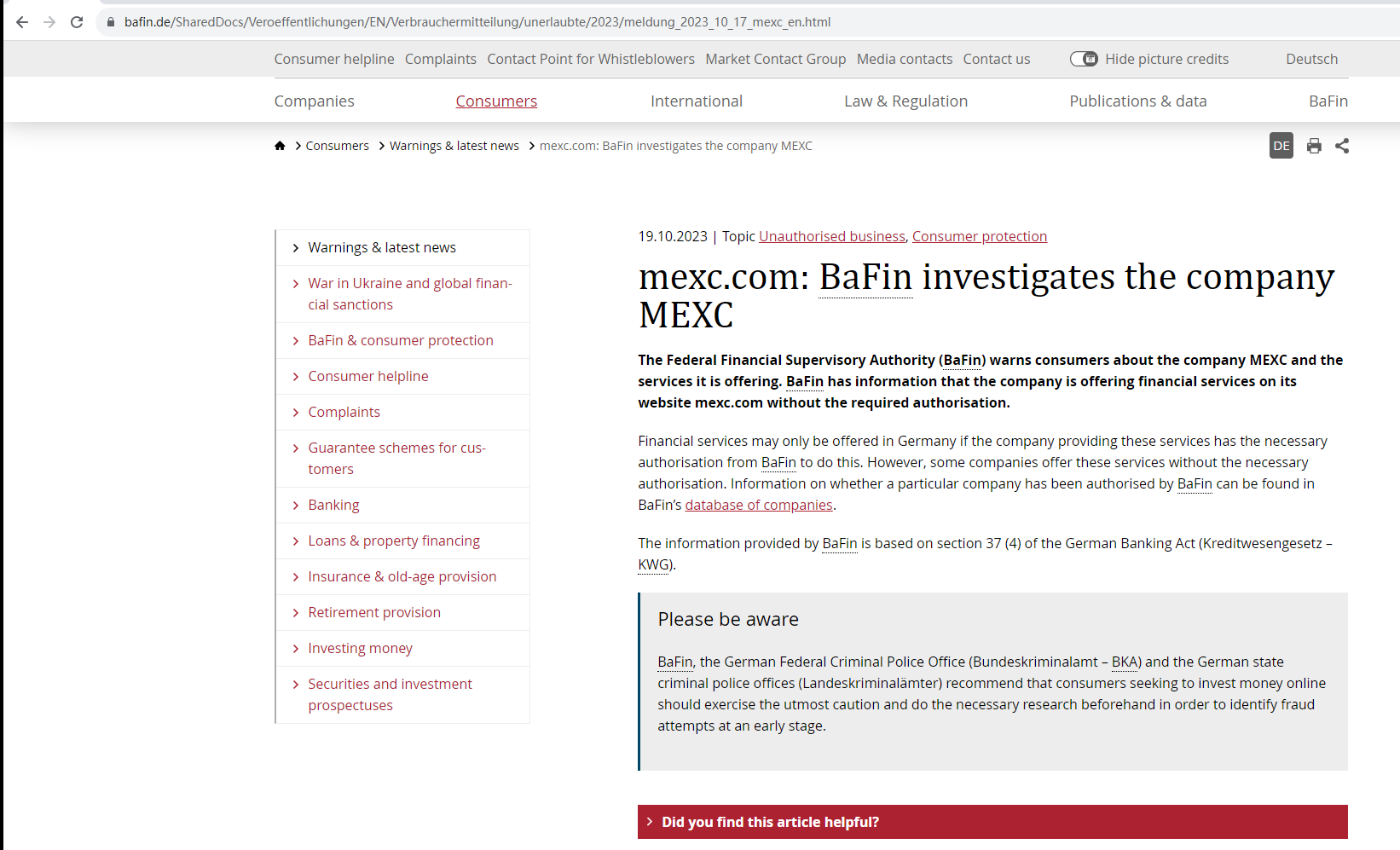 On 19 October 2023, the Federal Financial Supervisory Authority (BaFin) issued a warning that MEXC Global was providing financial services or products without authorisation. You may visit: https://www.bafin.de/SharedDocs/Veroeffentlichungen/EN/Verbrauchermitteilung/unerlaubte/2023/meldung_2023_10_17_mexc_en.html