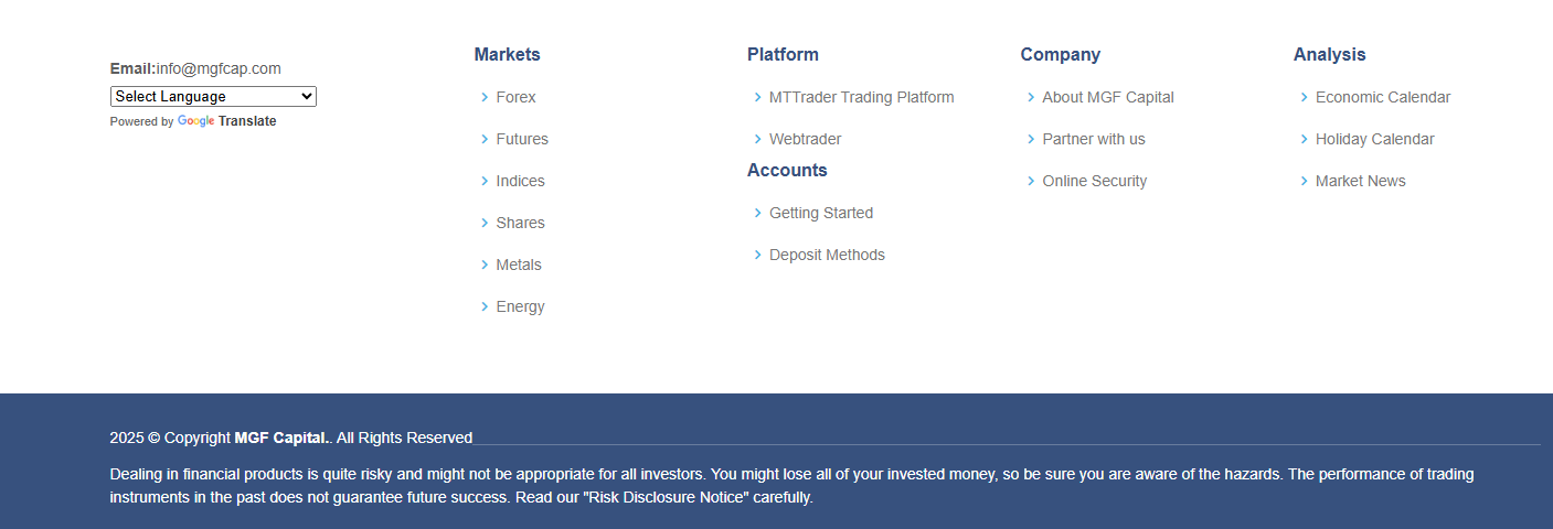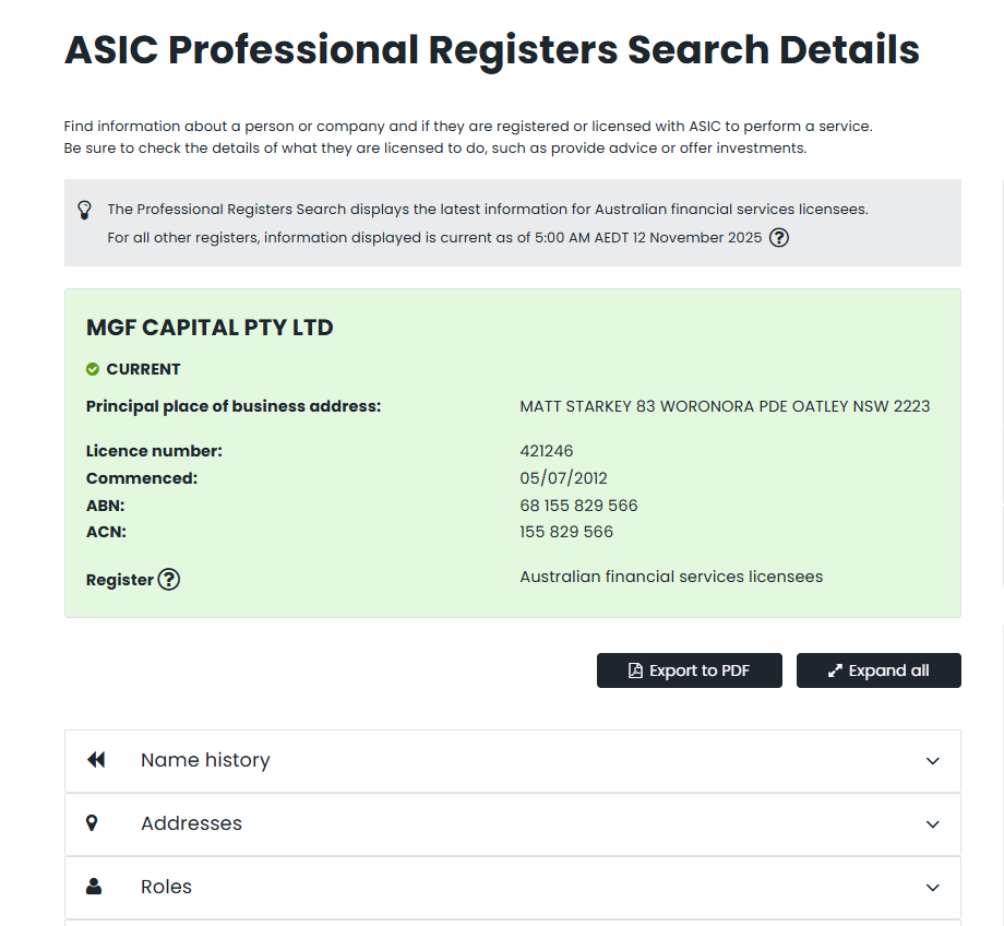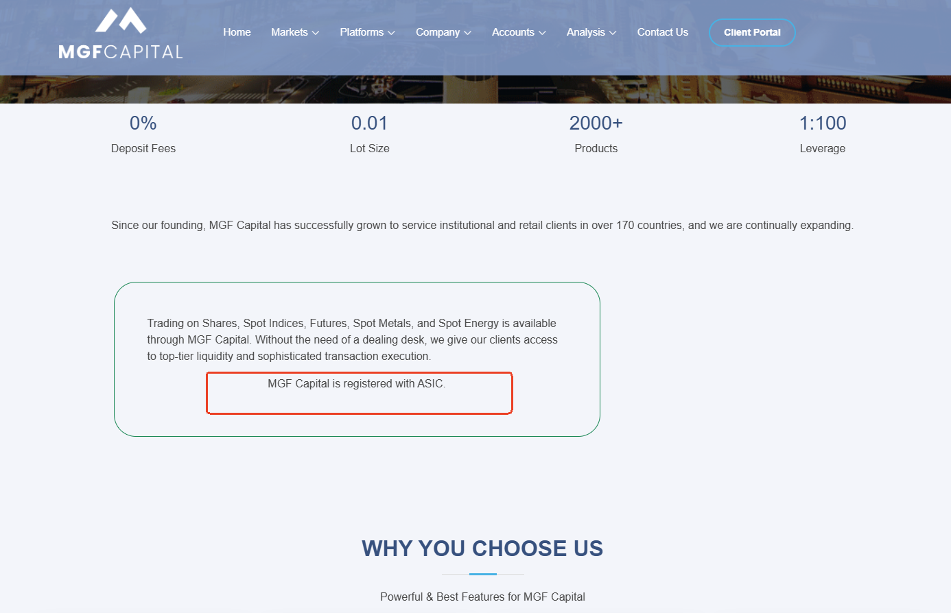 While MGF Capital's website claims to be registered with the Australian Securities and Investments Commission (ASIC), it conspicuously omits critical details such as its legal entity name, license number, and registered business address, making independent verification extremely difficult.