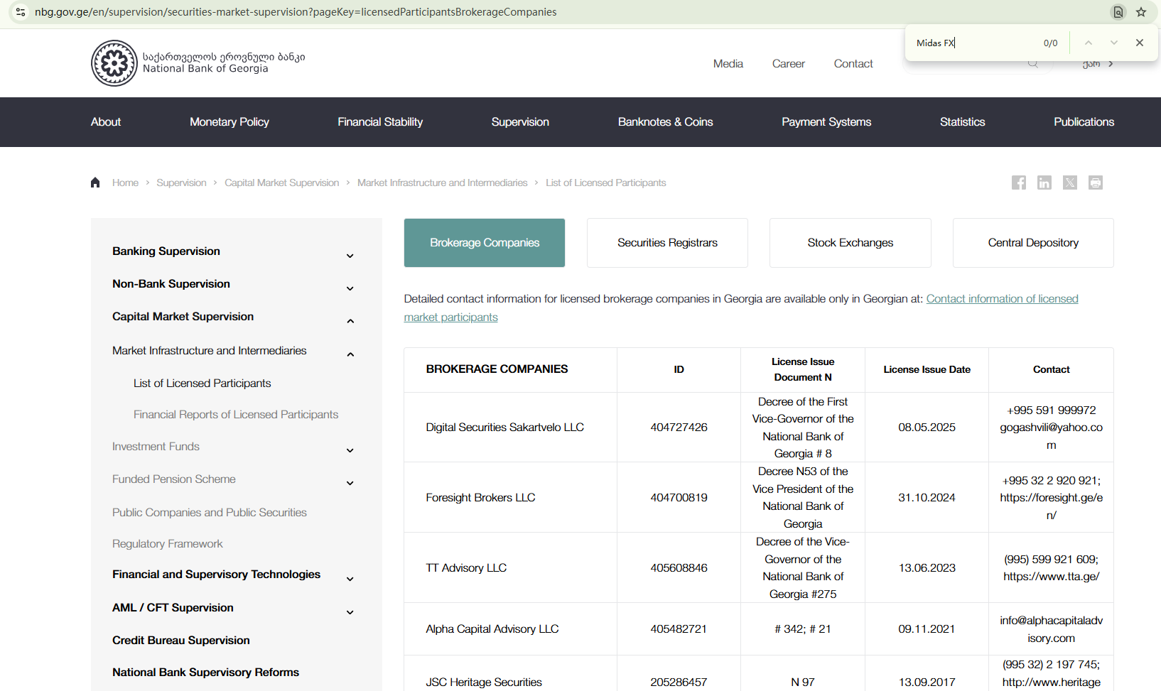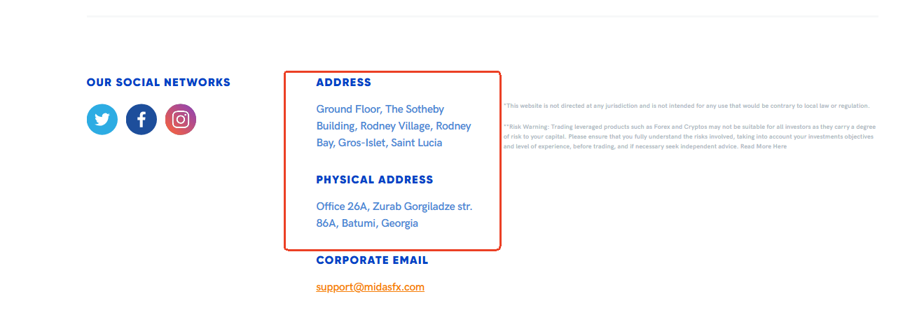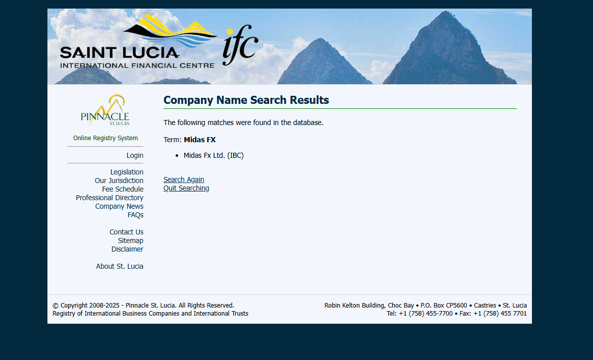 MIDASFX does not disclose any regulatory information, only displaying a registered address in Saint Lucia and a physical presence in Georgia. While we did locate Midas Fx Ltd. within the Saint Lucia IFC registry, this constitutes only an International Business Company (IBC) registration, not a license to operate as a forex broker. Notably, Saint Lucia currently has no financial authority that regulates forex trading activities. Furthermore, our search of the licensed brokerages list maintained by The National Bank of Georgia (NBG) yielded no record of this entity. Therefore, MIDASFX is not authorized by any recognized regulatory body, indicating a high likelihood of fraudulent operation.