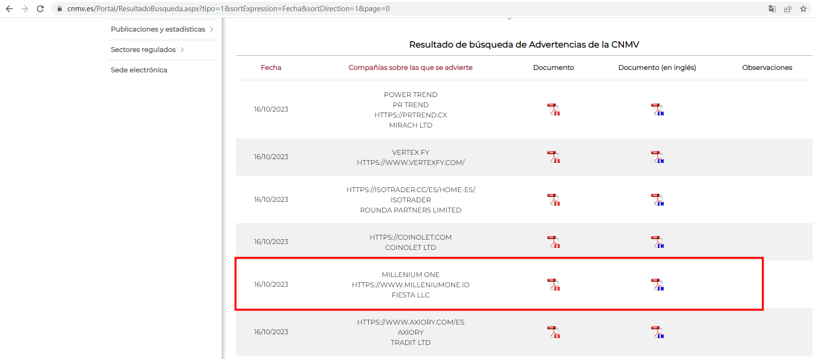 On 16 October 2023, the Comisión Nacional del Mercado de Valores (CNMV) issued a warning that MILLENIUM ONE was providing financial services or products without authorisation. You may visit: https://www.cnmv.es/Portal/ResultadoBusqueda.aspx?tipo=1&sortExpression=Fecha&sortDirection=1&page=0