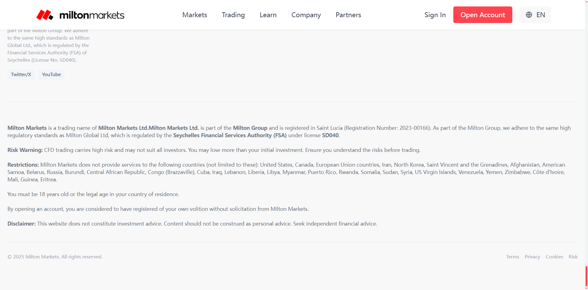 Milton Markets claims to be registered in Saint Lucia, and while we found Milton Markets Ltd. in the Saint Lucia International Financial Centre registry, this only confers International Business Company status, which is not a valid financial license. The platform also claims affiliation with the Milton Group and states it follows the regulatory standards of Milton Global Ltd., which is licensed by the Seychelles Financial Services Authority. However, our verification shows that the licensed entity operates under the domain https://www.miltonprime.com, and there is no verifiable connection between Milton Prime and Milton Markets. Due to this inconsistency and the apparent misuse of another entity's regulatory information, we conclude that Milton Markets is misrepresenting its regulatory status. Therefore, we classify Milton Markets as a fraudulent broker.