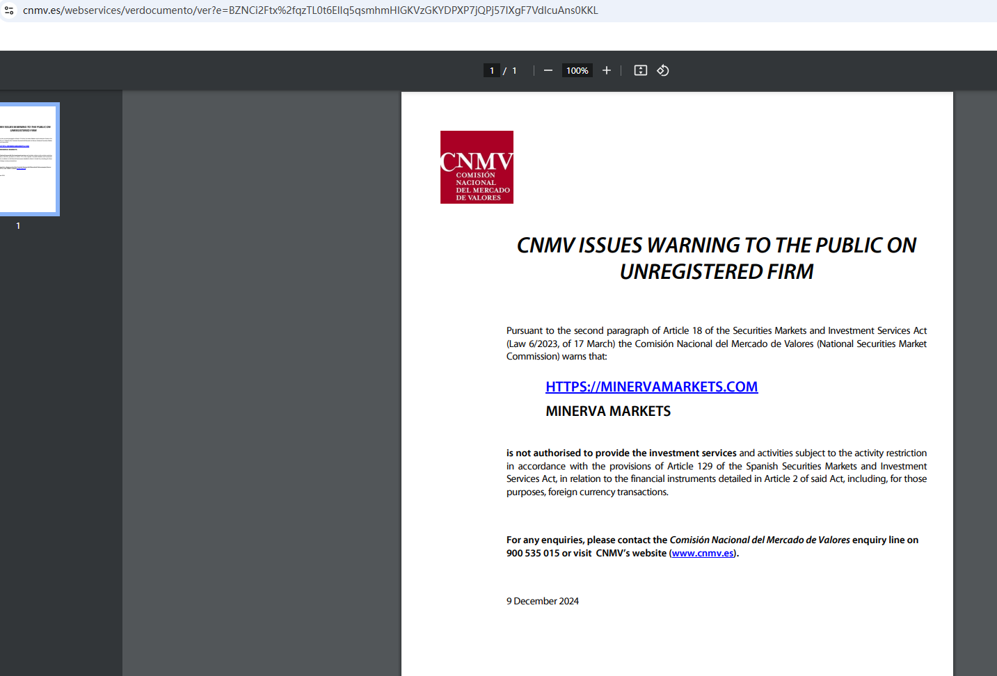 In addition, the Comisión Nacional del Mercado de Valores (CNMV) has added Minerva Markets to its warning list for providing investment services without authorization.