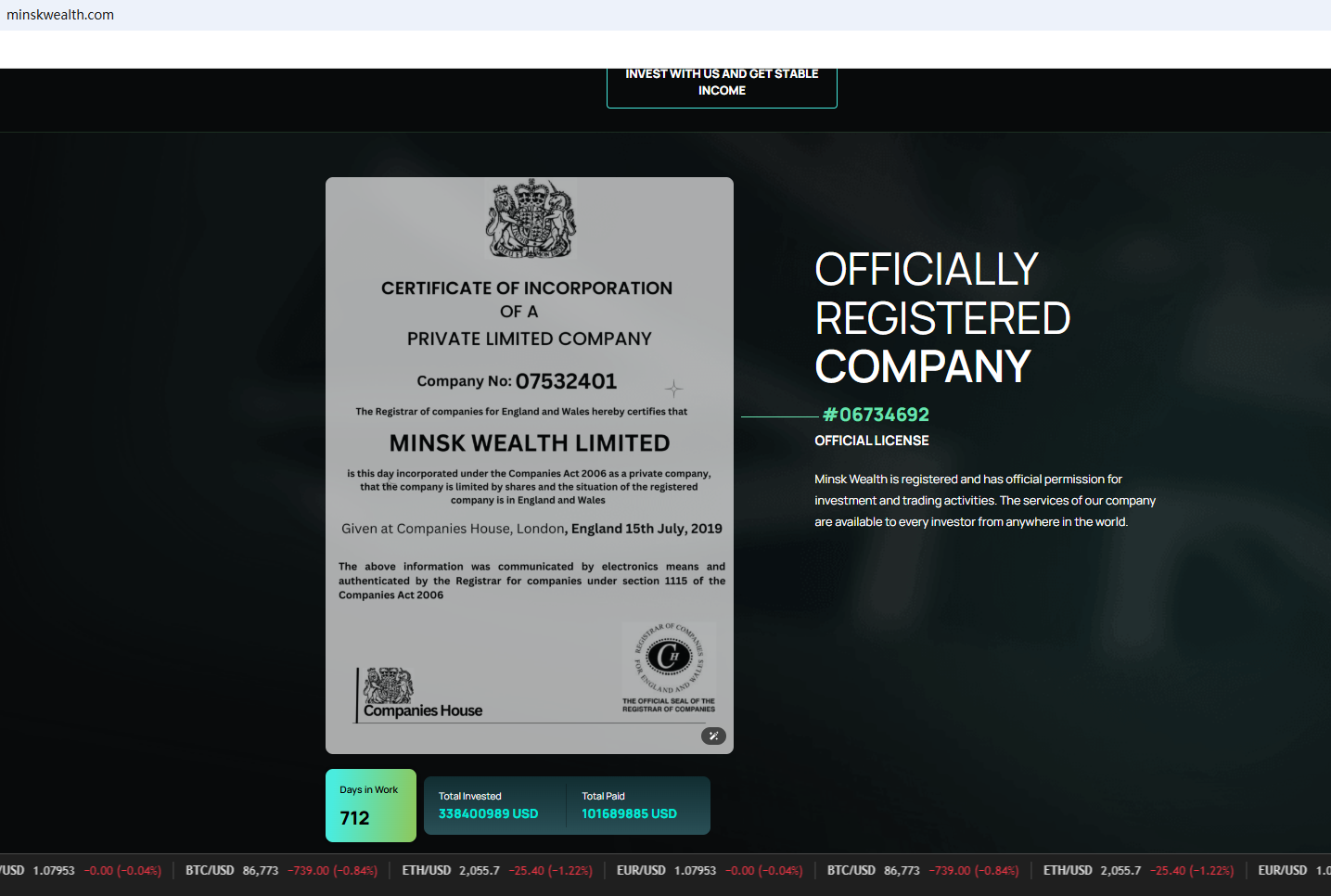 It displays a certificate from Companies House (CH) on its website, but as we all know, CH is only a company registration agency and does not have the right to regulate foreign exchange. To exercise foreign exchange in the UK, it must be regulated by the Financial Conduct Authority (FCA). The funny thing is that the Financial Conduct Authority (FCA) issued a warning against Minsk Wealth Ltd for the lack of the required authorization.