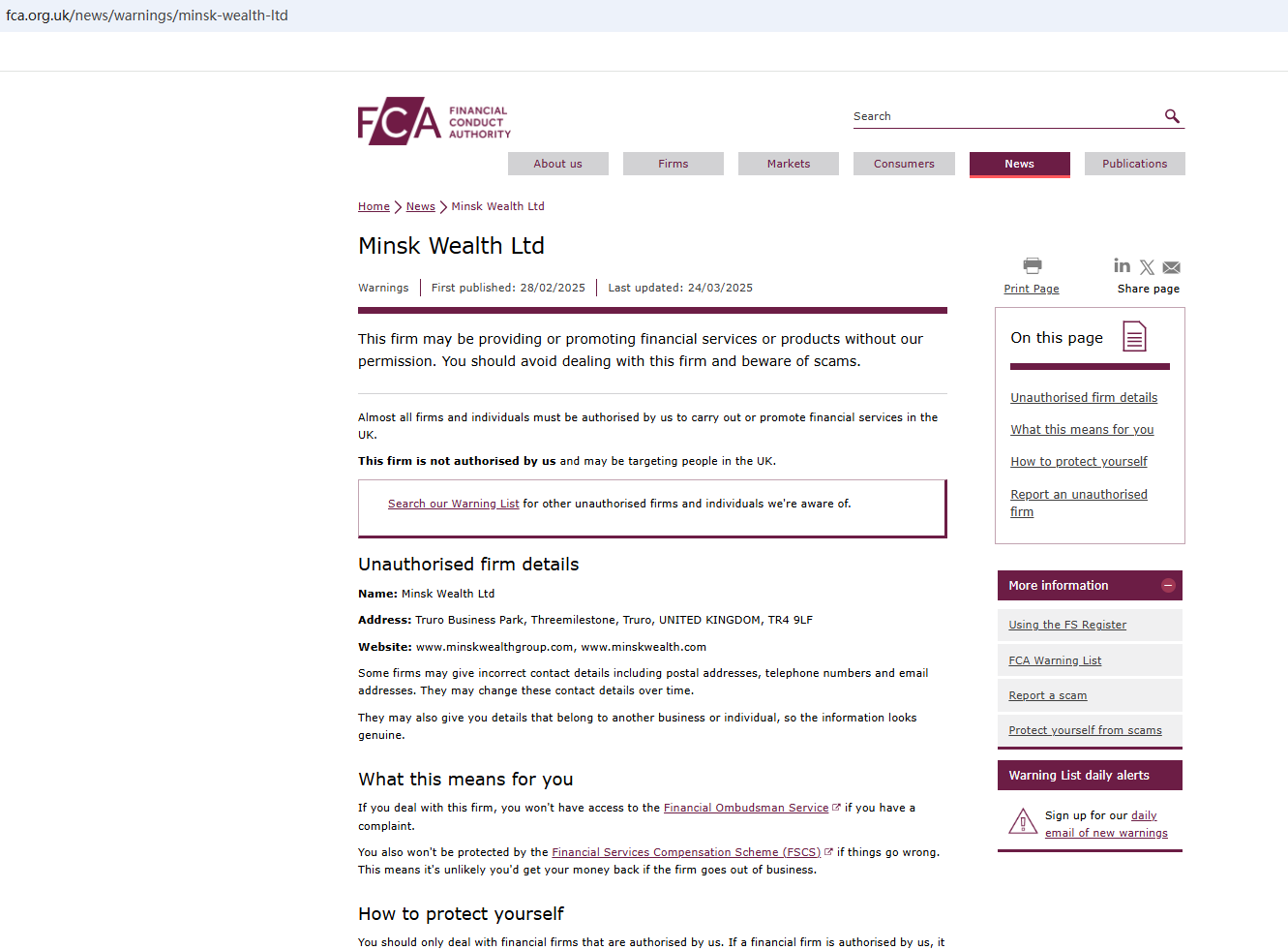 On March 24, 2025, the Financial Conduct Authority (FCA) issued a warning against Minsk Wealth Ltd for the lack of the required authorization. https://www.fca.org.uk/news/warnings/minsk-wealth-ltd