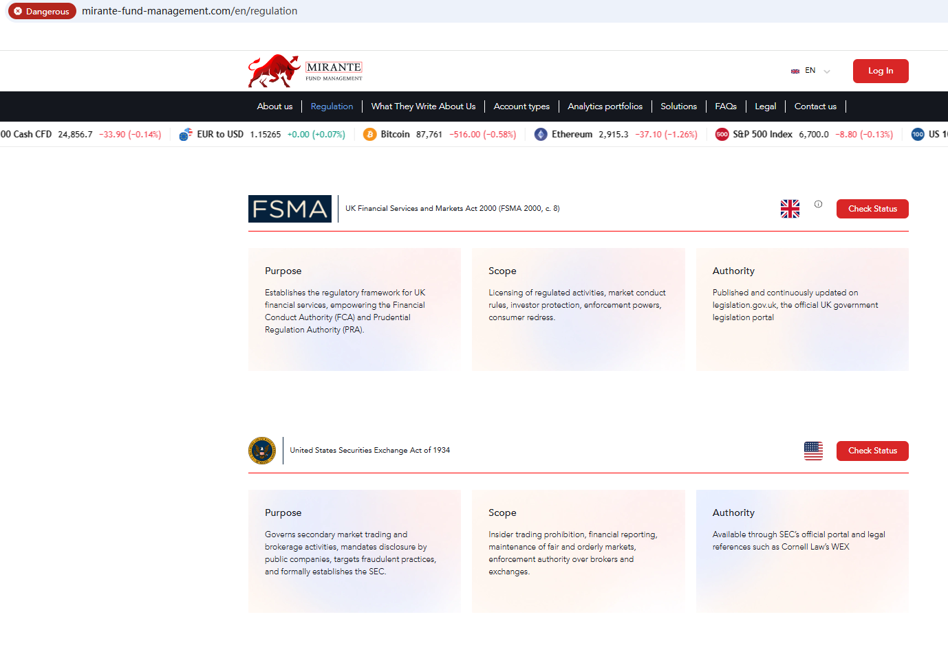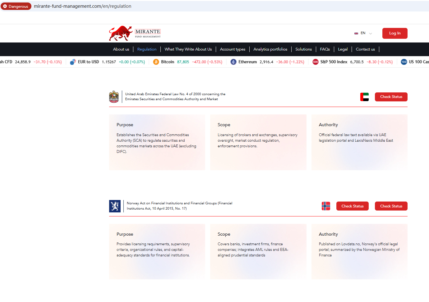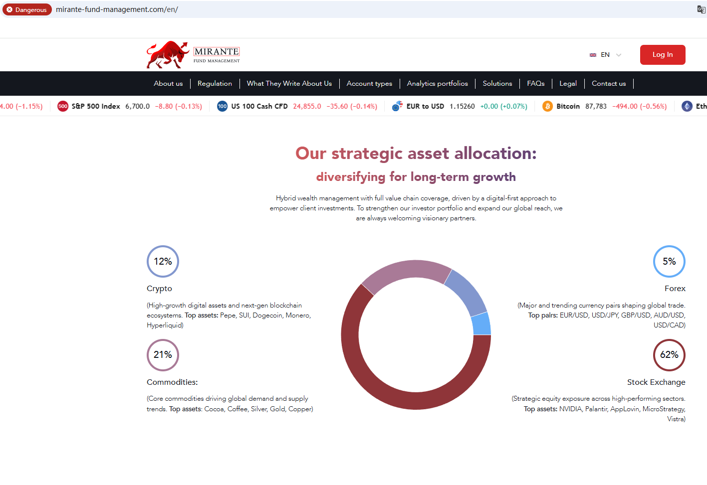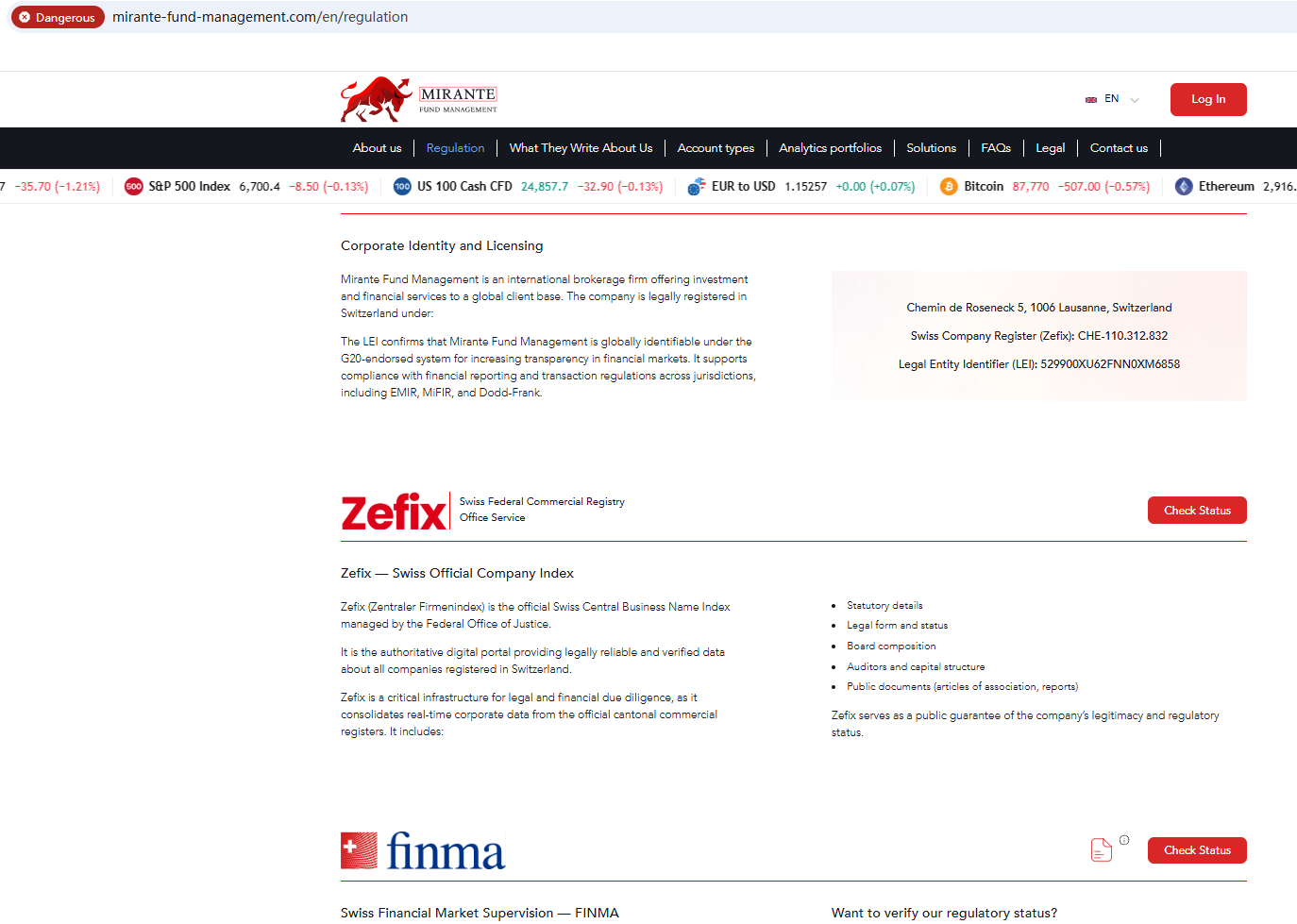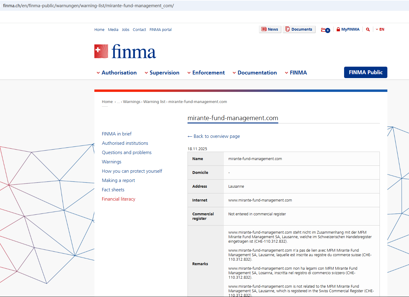 On Nov 18, 2025, the Swiss Financial Market Supervisory Authority (FINMA) issued a warning against Mirante Fund Management, stating that this broker is not entered in its commercial register. https://www.finma.ch/en/finma-public/warnungen/warning-list/mirante-fund-management_com/
