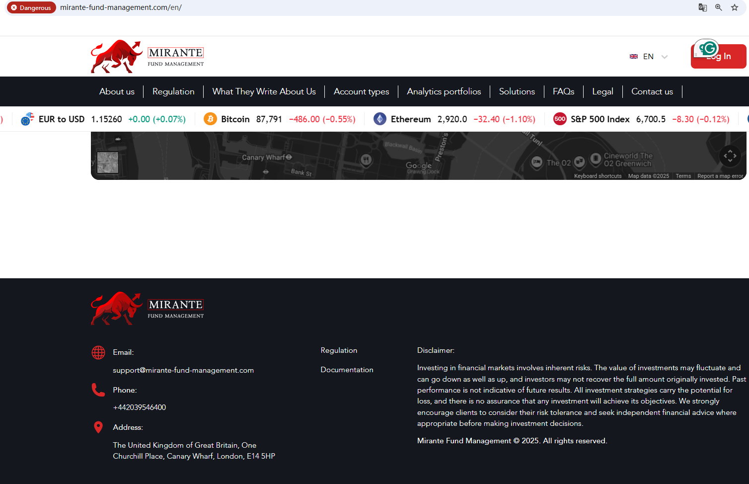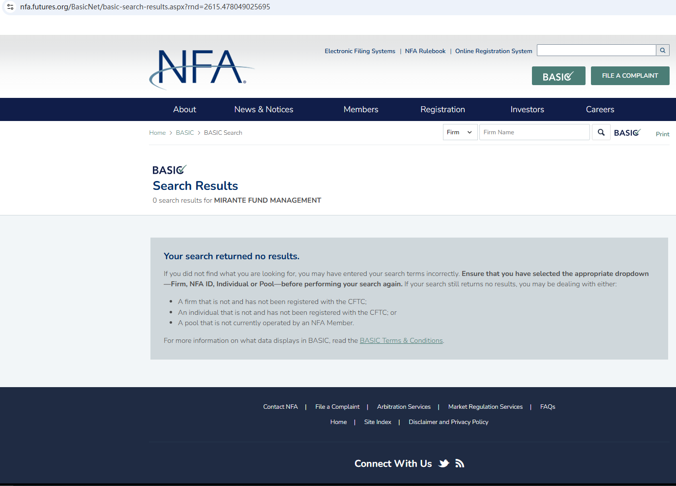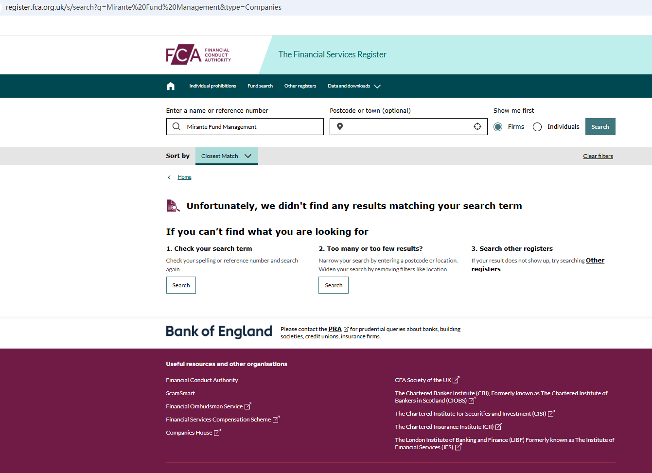In fact, Mirante Fund Management is not regulated by any authority. Therefore, Mirante Fund Management is a scam.