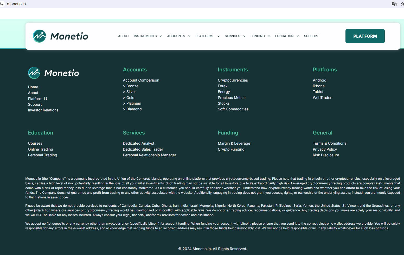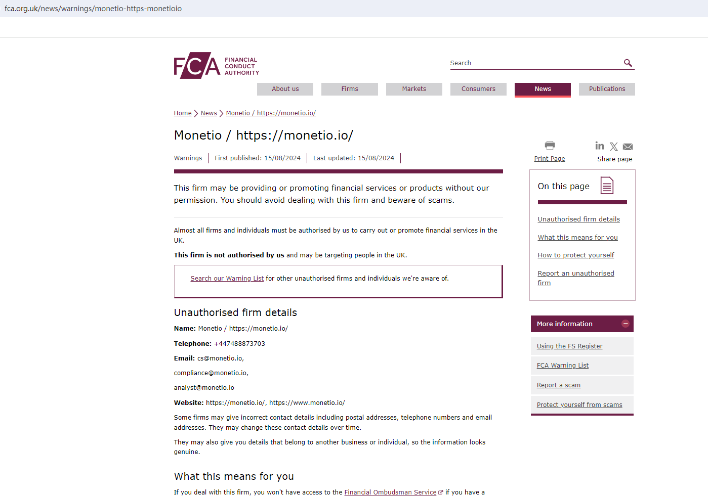 What's more, we found that the Financial Conduct Authority (FCA) issued a warning against Monetio, believing this company might be providing financial services or products without proper authorization in the UK.