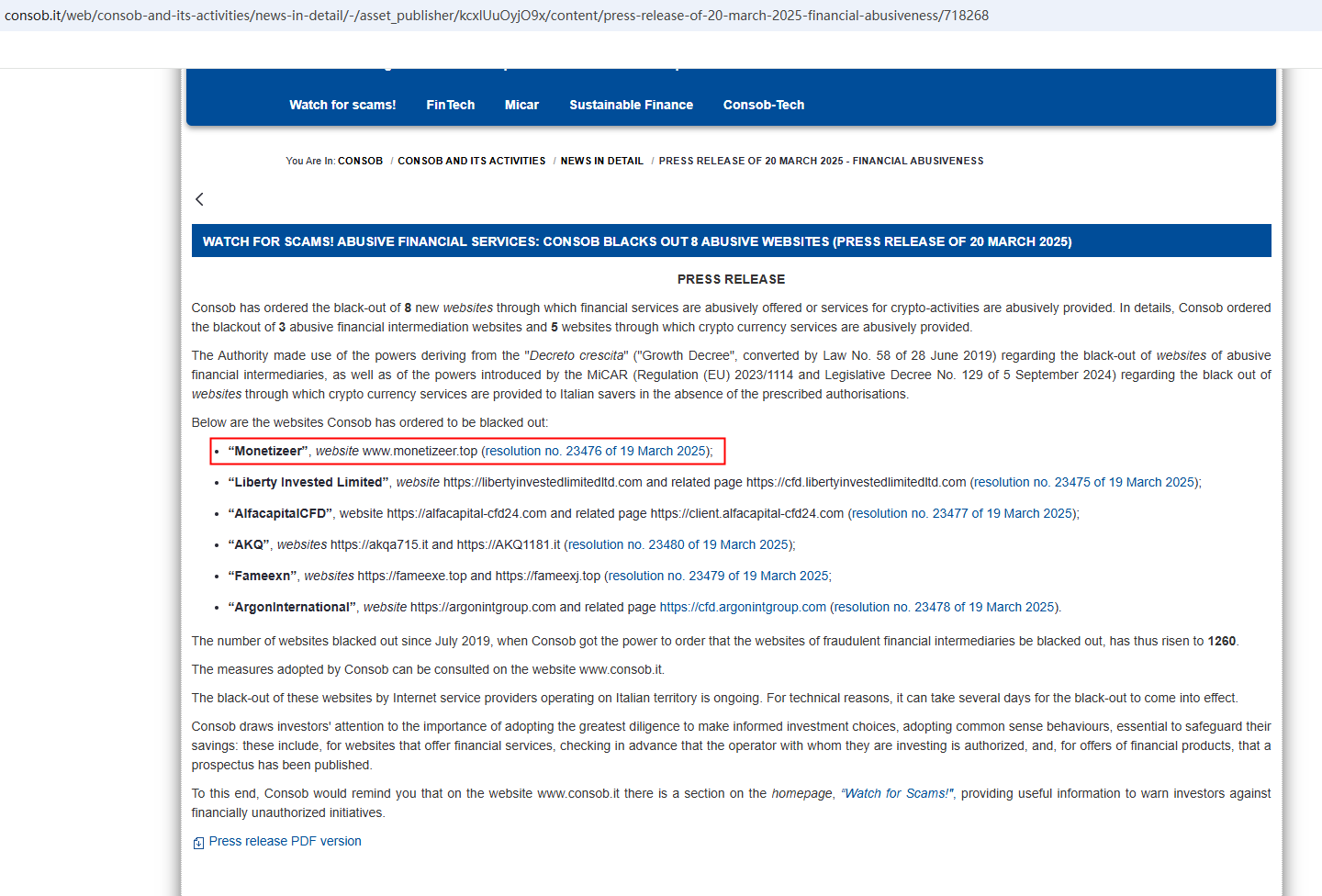 On March 20, 2025, the Italian Companies and Exchange Commission (CONSOB) ordered Monetizeer to be blacked out since it offers financial services illegally in Italy. https://www.consob.it/web/consob-and-its-activities/news-in-detail/-/asset_publisher/kcxlUuOyjO9x/content/press-release-of-20-march-2025-financial-abusiveness/718268