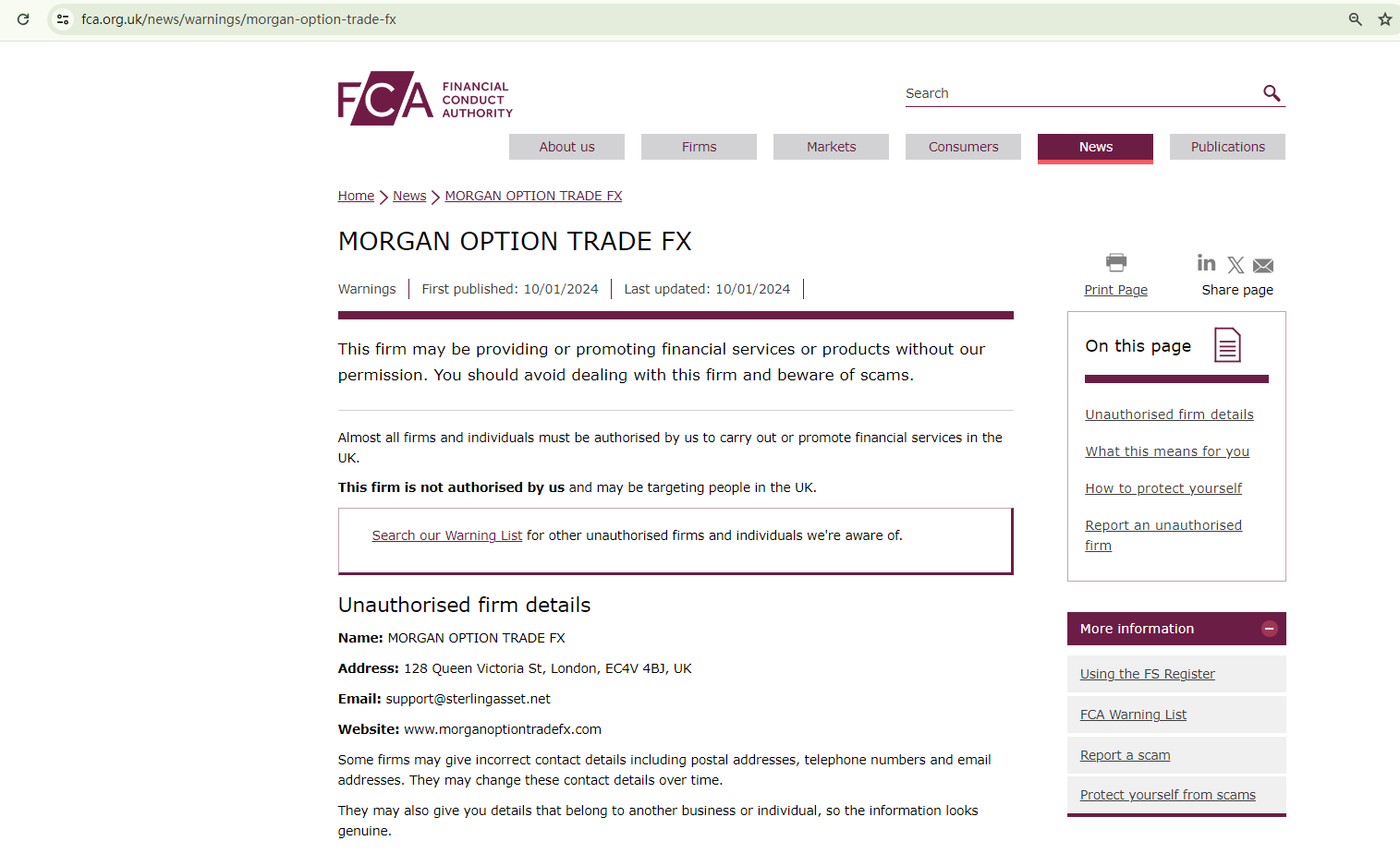 On January 10, 2024, the Financial Conduct Authority (FCA) issued a warning against Morgan Option Trade Fx, believing this company might be providing financial services or products without proper authorization in the UK. https://www.fca.org.uk/news/warnings/morgan-option-trade-fx