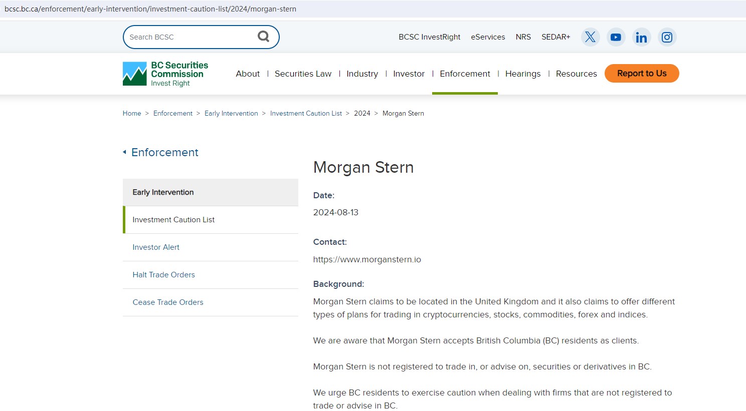Morgan Stern (https://www.morganstern.io), believing that this broker is not registered to trade in, or advise on, securities or derivatives in BC. https://www.bcsc.bc.ca/enforcement/early-intervention/investment-caution-list/2024/morgan-stern.