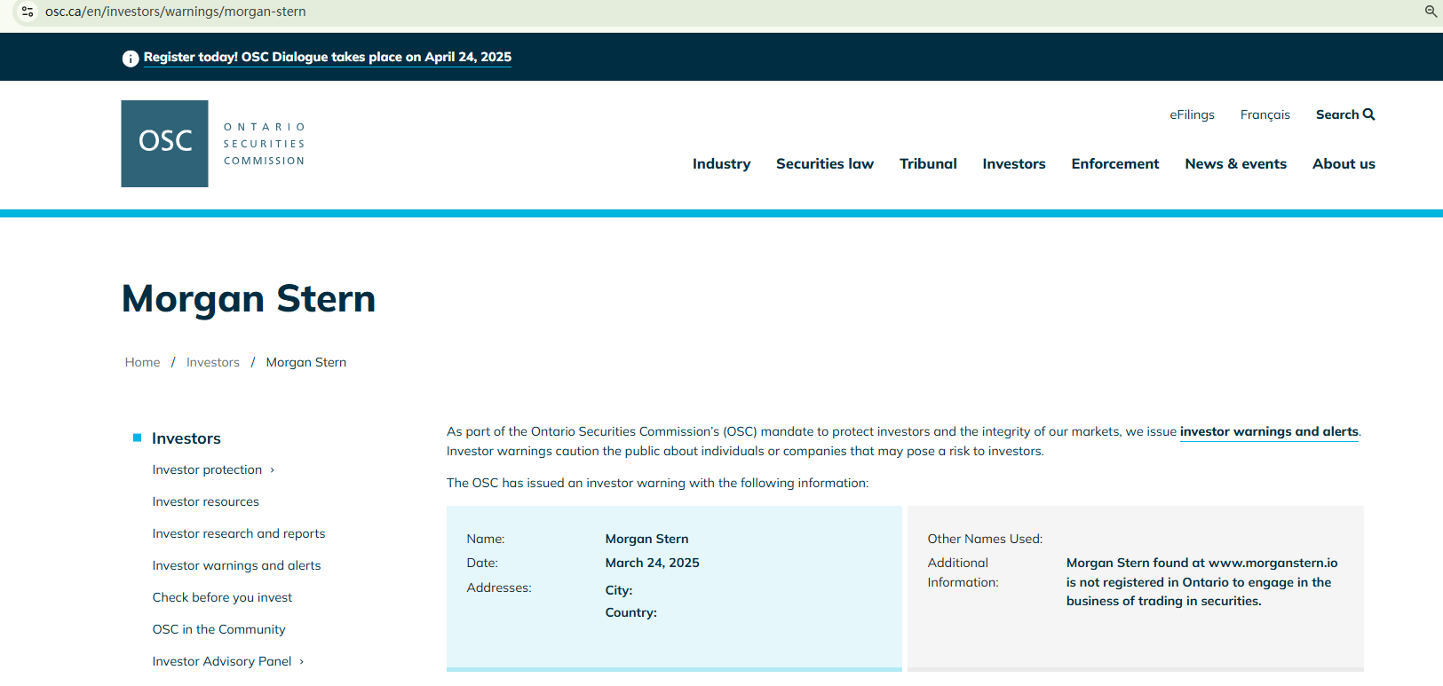 On March 24, 2025, the Ontario Securities Commission (OSC) issued a warning against Morgan Stern, stating that this broker is not registered in Ontario to engage in the business of trading in securities. https://www.osc.ca/en/investors/warnings/morgan-stern