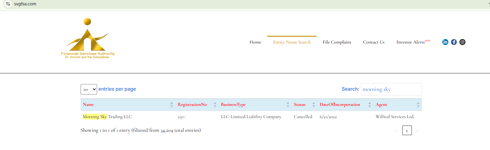 The website of Morning Sky is currently unavailable. The claimed registration with the Financial Services Authority of St. Vincent and The Grenadines (SVG FSA) has been canceled as well. All the signs indicate substantial risks of Morning Sky. Investors should be informed about the development and stay clear of it.