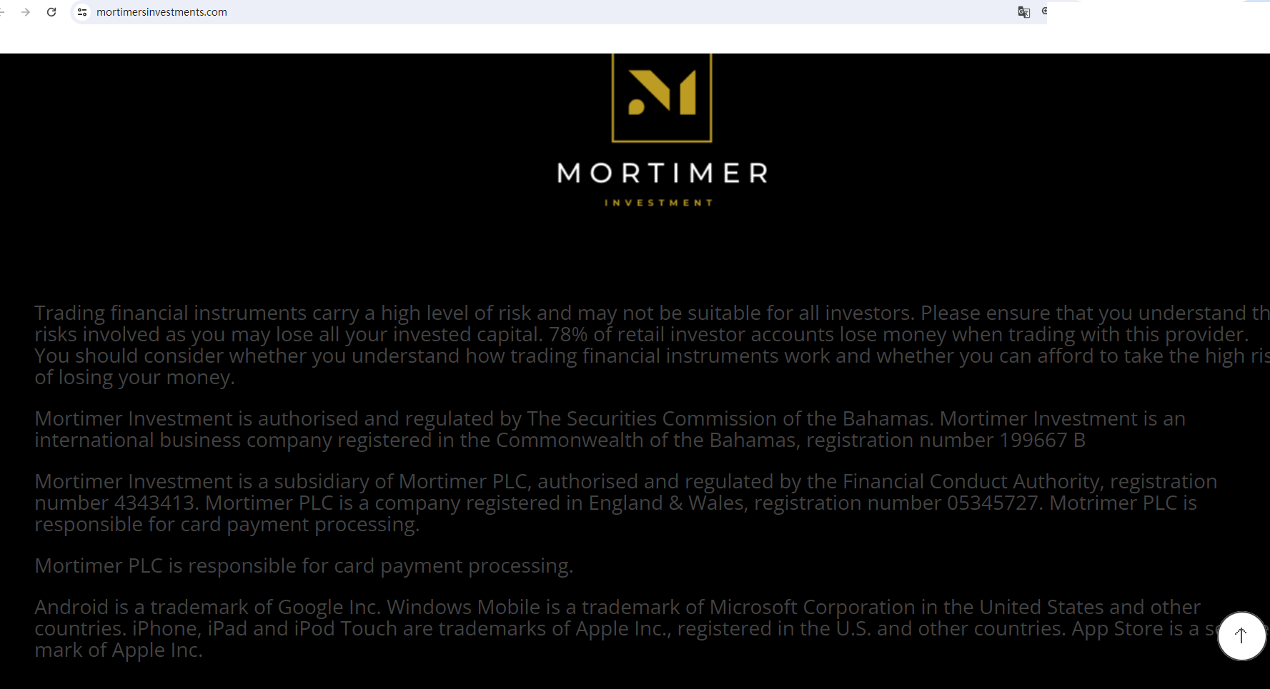 According to its website, Mortimer Investment is authorised and regulated by The Securities Commission of the Bahamas (SCB), registration number is 199667 B. In addition, Mortimer Investment is a subsidiary of Mortimer PLC, authorised and regulated by the Financial Conduct Authority (FCA), registration number 4343413. Mortimer PLC is a company registered in England & Wales, registration number is 05345727. Upon investigation, no matching information was found in the SCB and FCA.