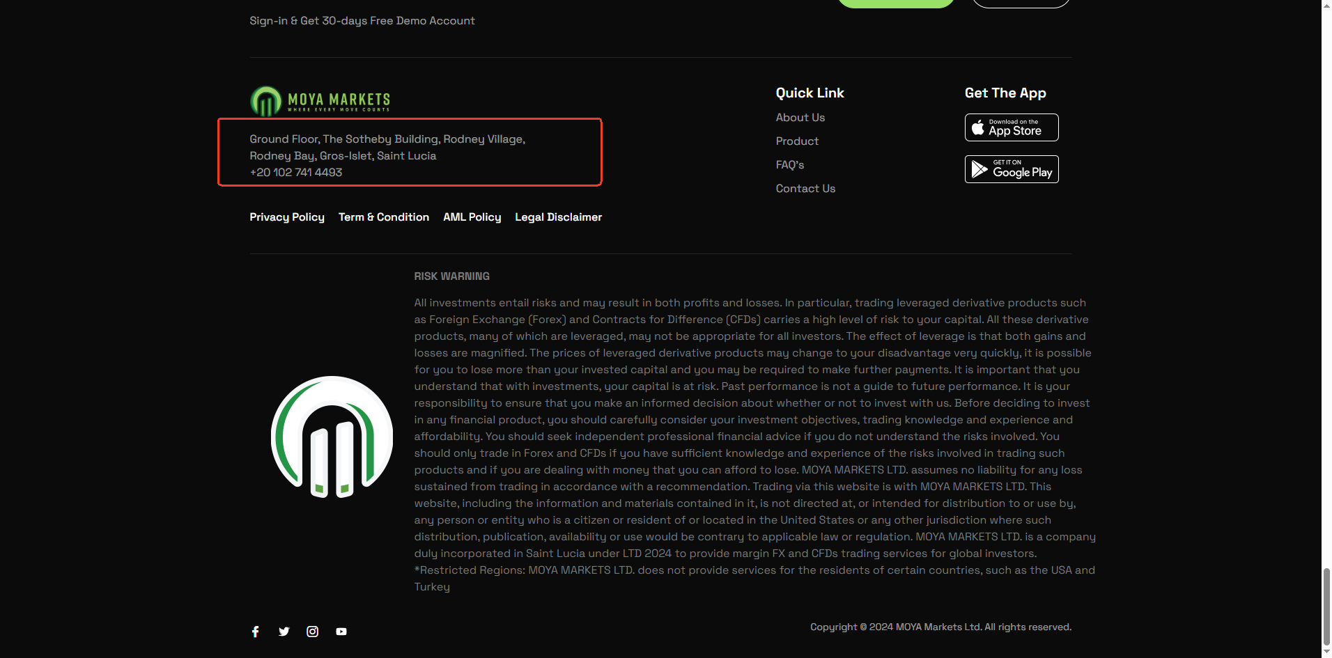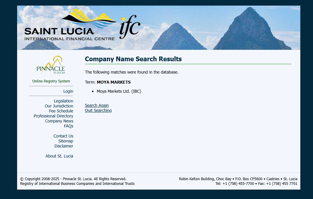 MOYA Markets claims to operate under MOYA MARKETS LTD, which is registered in Saint Lucia. While we can confirm that a company with the same name is registered with the Saint Lucia International Financial Centre (IFC), please note that this registration merely grants it International Business Company (IBC) status. This does not constitute a valid financial licence. The IFC neither regulates nor licenses forex trading activities.
