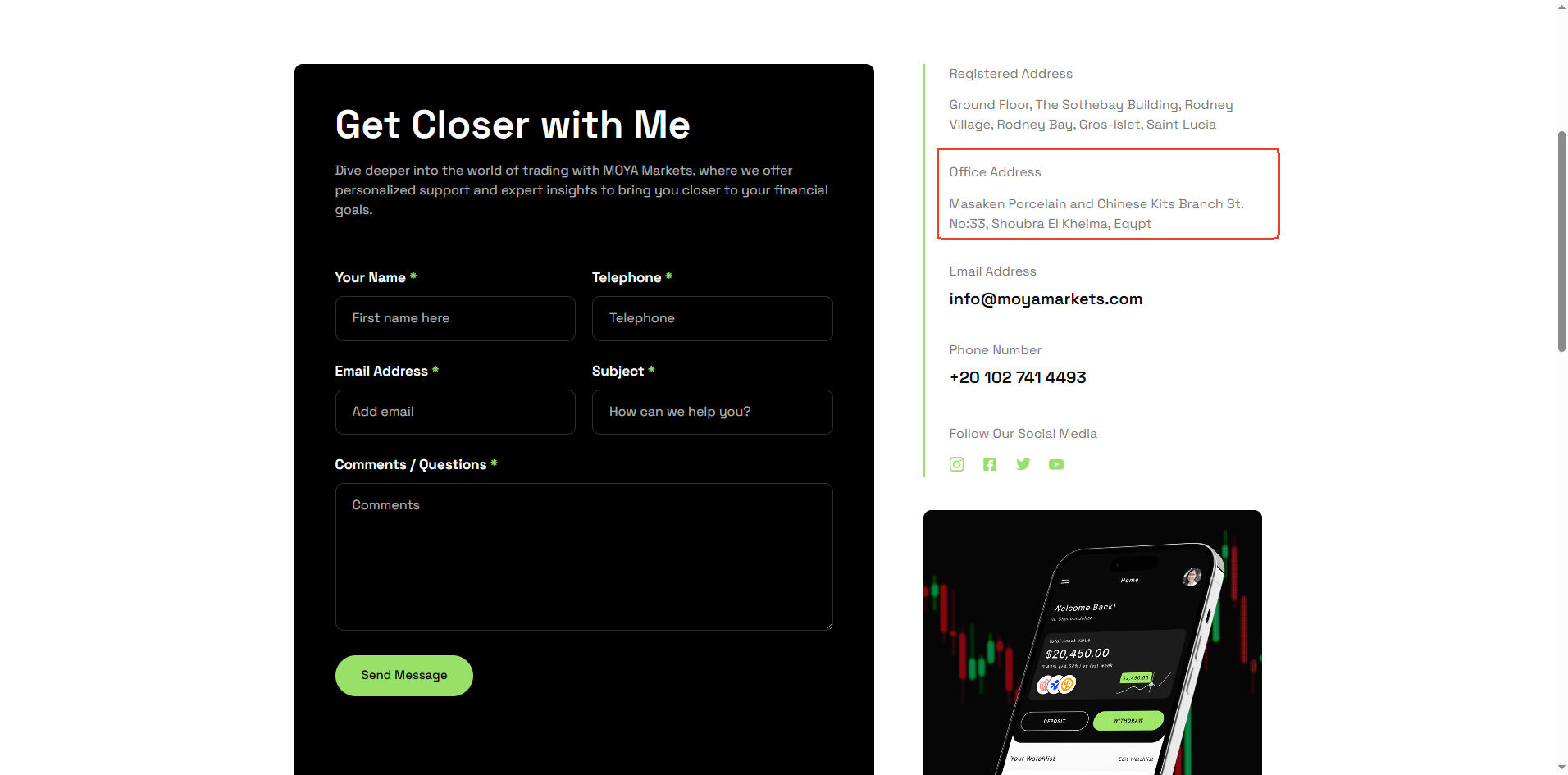 MOYA Markets also claims to have an office in Egypt. However, Egypt currently has no regulatory authority that licenses forex trading activities.