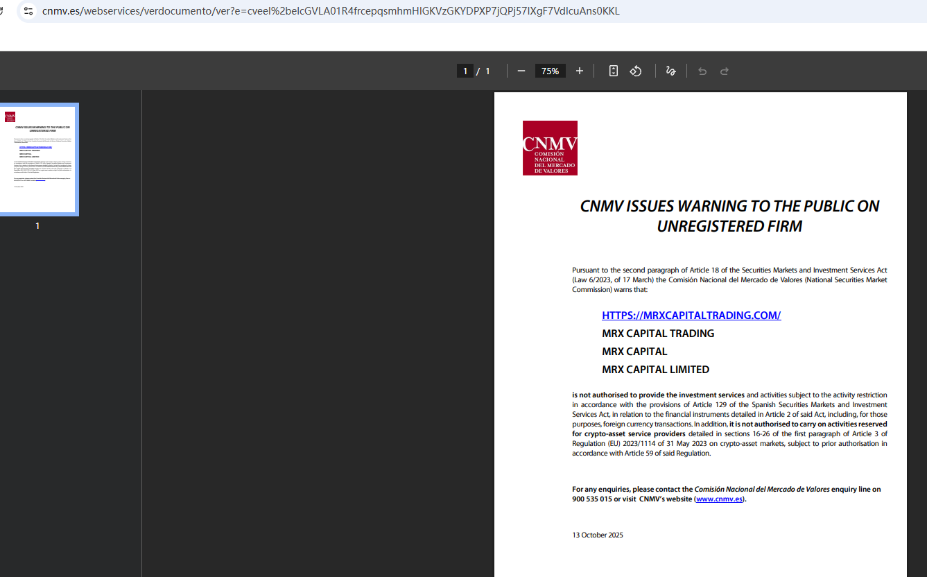 On Oct 13, 2025, the National Securities Market Commission (CNMV) issued a warning against MRX CAPITAL, believing this company might be providing financial services or products without proper authorization. https://www.cnmv.es/webservices/verdocumento/ver?e=cveel%2belcGVLA01R4frcepqsmhmHlGKVzGKYDPXP7jQPj57IXgF7VdIcuAns0KKL