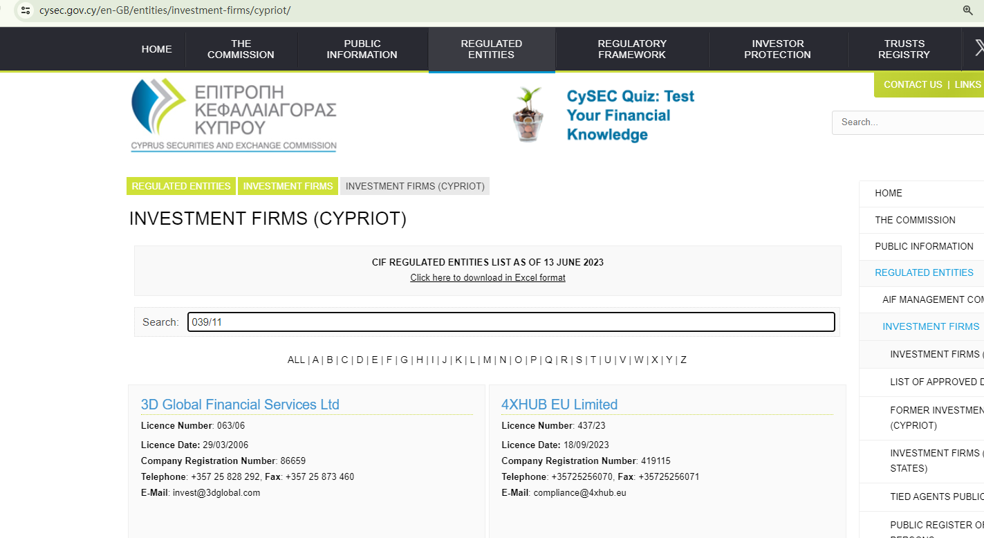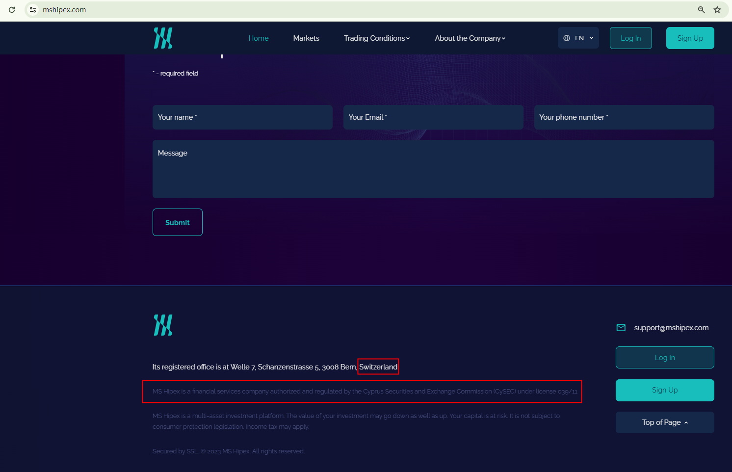 MS Hipex asserts that it is licensed by the Cyprus Securities and Exchange Commission (CySEC) under license number 039/11. However, this license number is non-existent, and MS Hipex is not listed in the CySEC register, indicating that the regulatory information it provides is false.