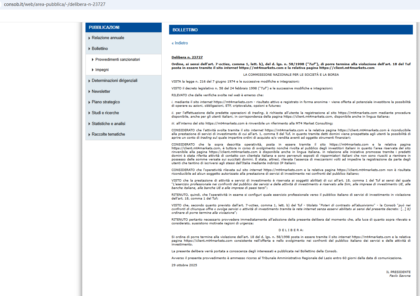 On Oct 29, 2025, the Italian Companies and Exchange Commission (CONSOB) ordered MT4 Markets to be blacked out since it offers financial services illegally in Italy. https://www.consob.it/web/area-pubblica/-/delibera-n-23727