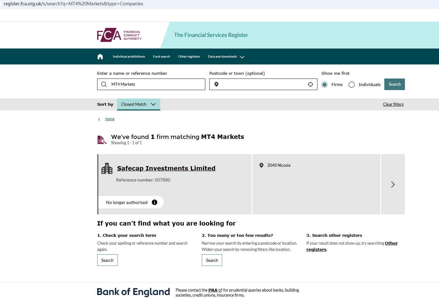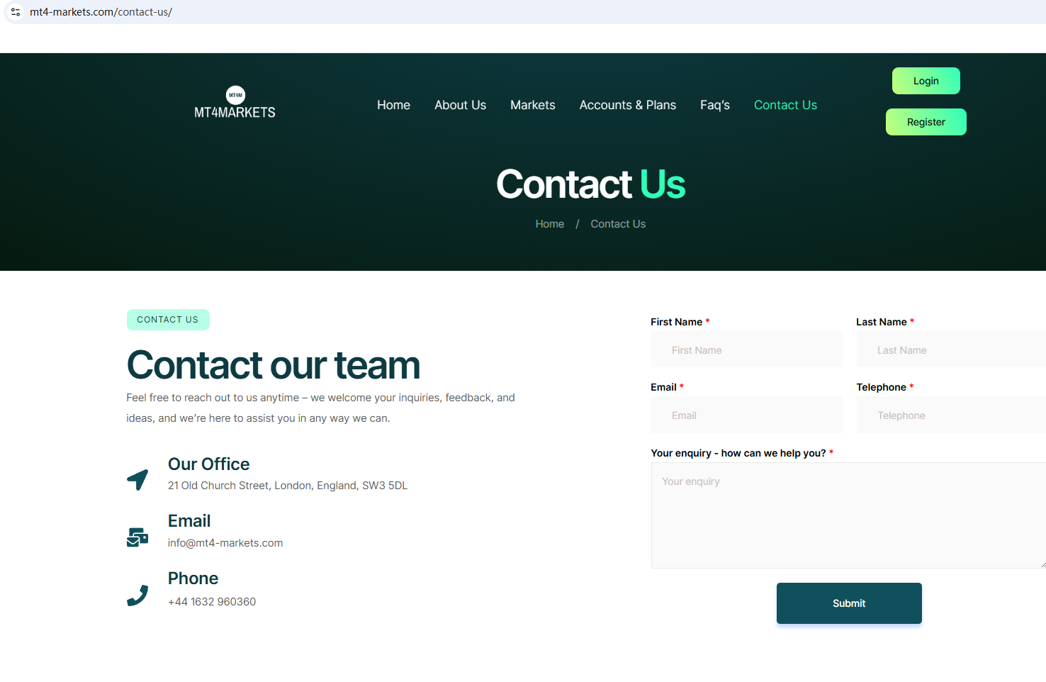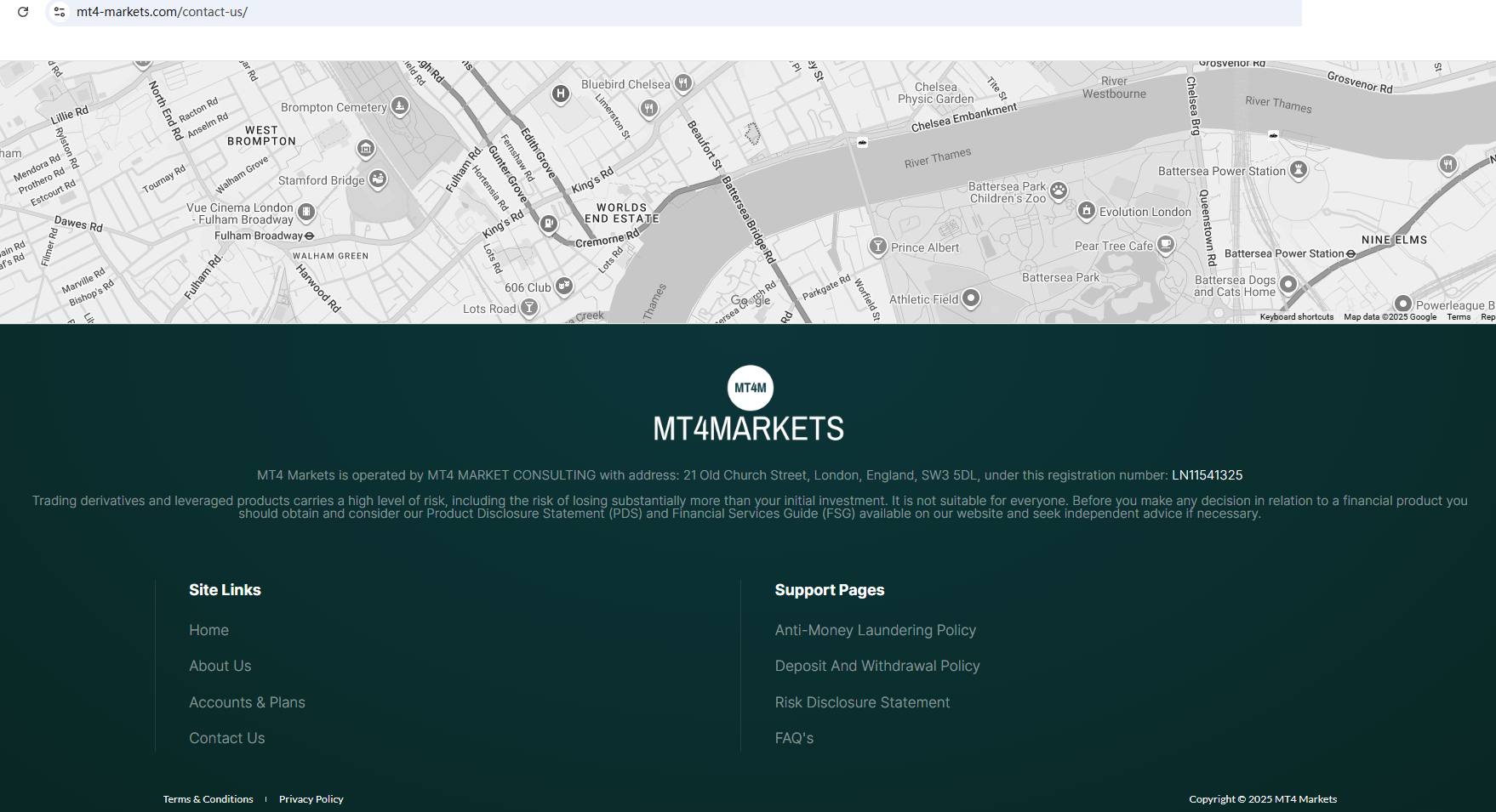 According to its website, it is located in the UK. Upon investigation, no matching information was found in the Financial Conduct Authority (FCA). In addition, the Italian Companies and Exchange Commission (CONSOB) ordered MT4 Markets to be blacked out since it offers financial services illegally in Italy.