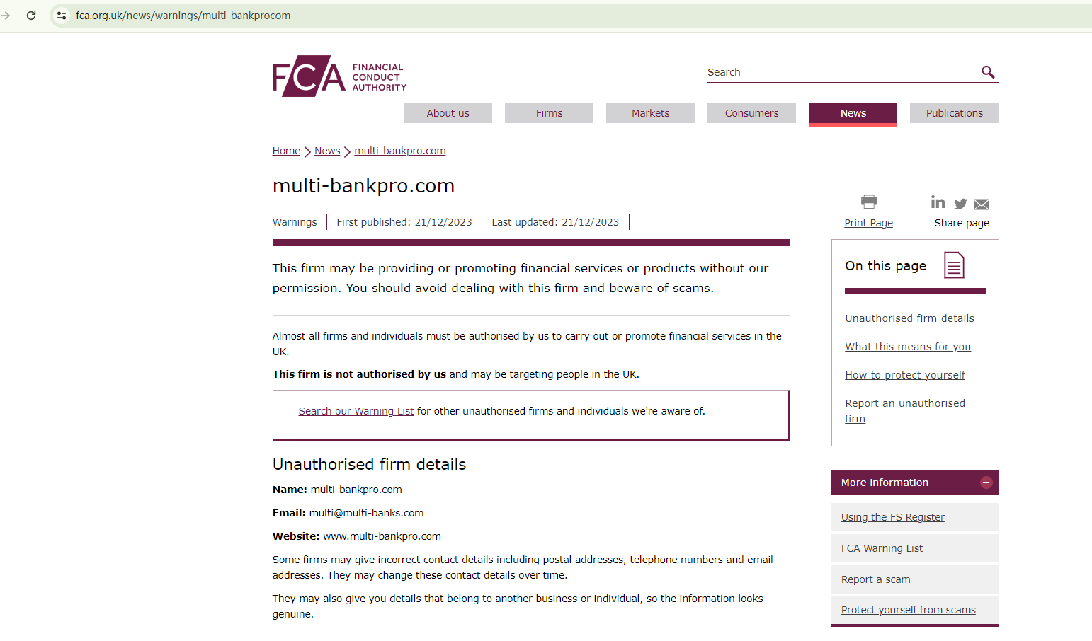On December 21, 2023, the Financial Conduct Authority (FCA) issued a warning against multi-bankpro.com, identifying it as an unauthorized firm in the UK. https://www.fca.org.uk/news/warnings/multi-bankprocom