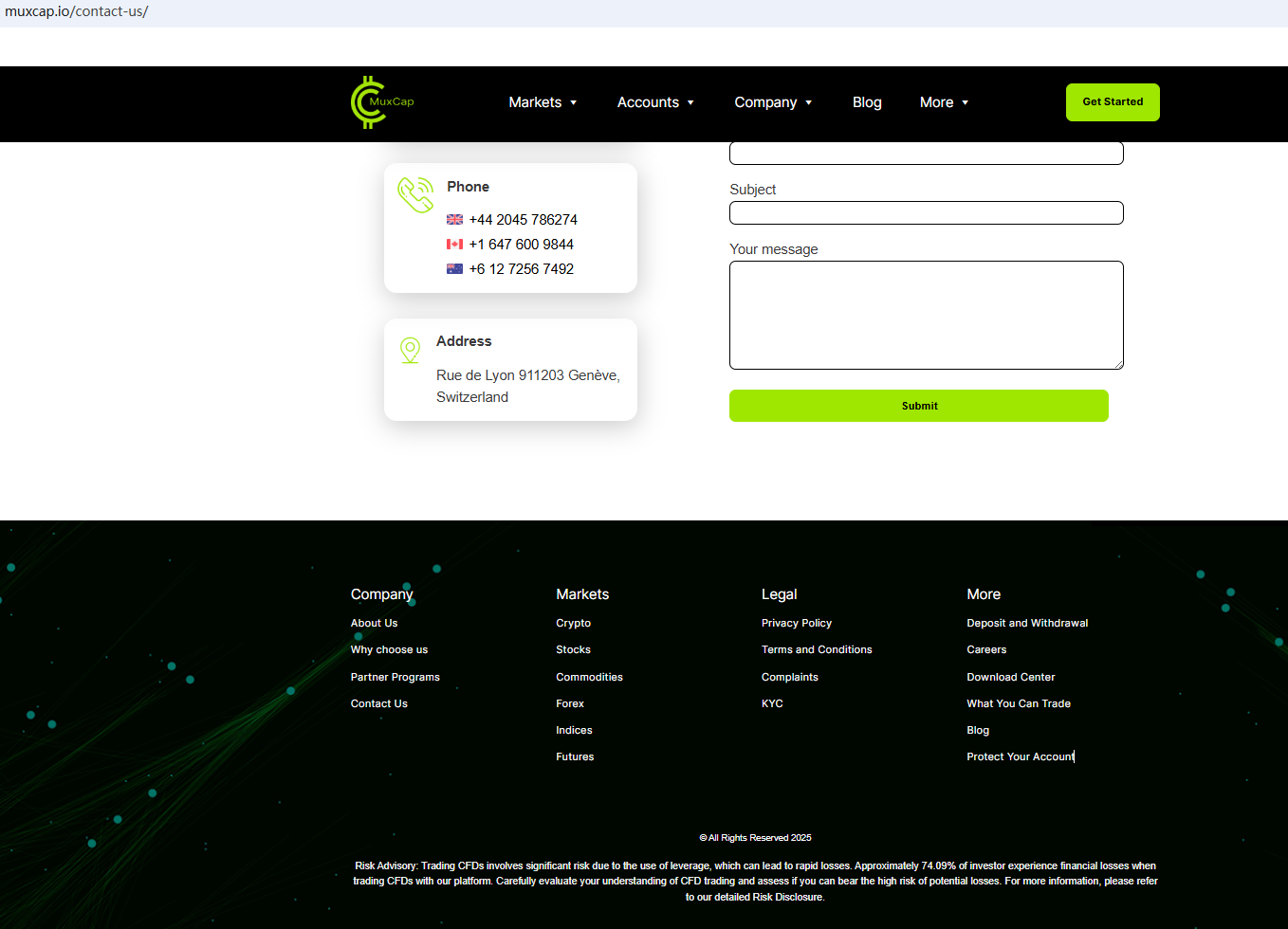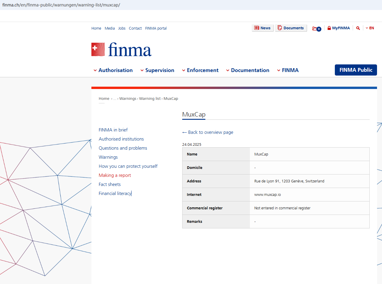 On April 24, 2025, the Swiss Financial Market Supervisory Authority (FINMA) issued a warning against MuxCap, stating that this broker had not entered into its commercial register. https://www.finma.ch/en/finma-public/warnungen/warning-list/muxcap/