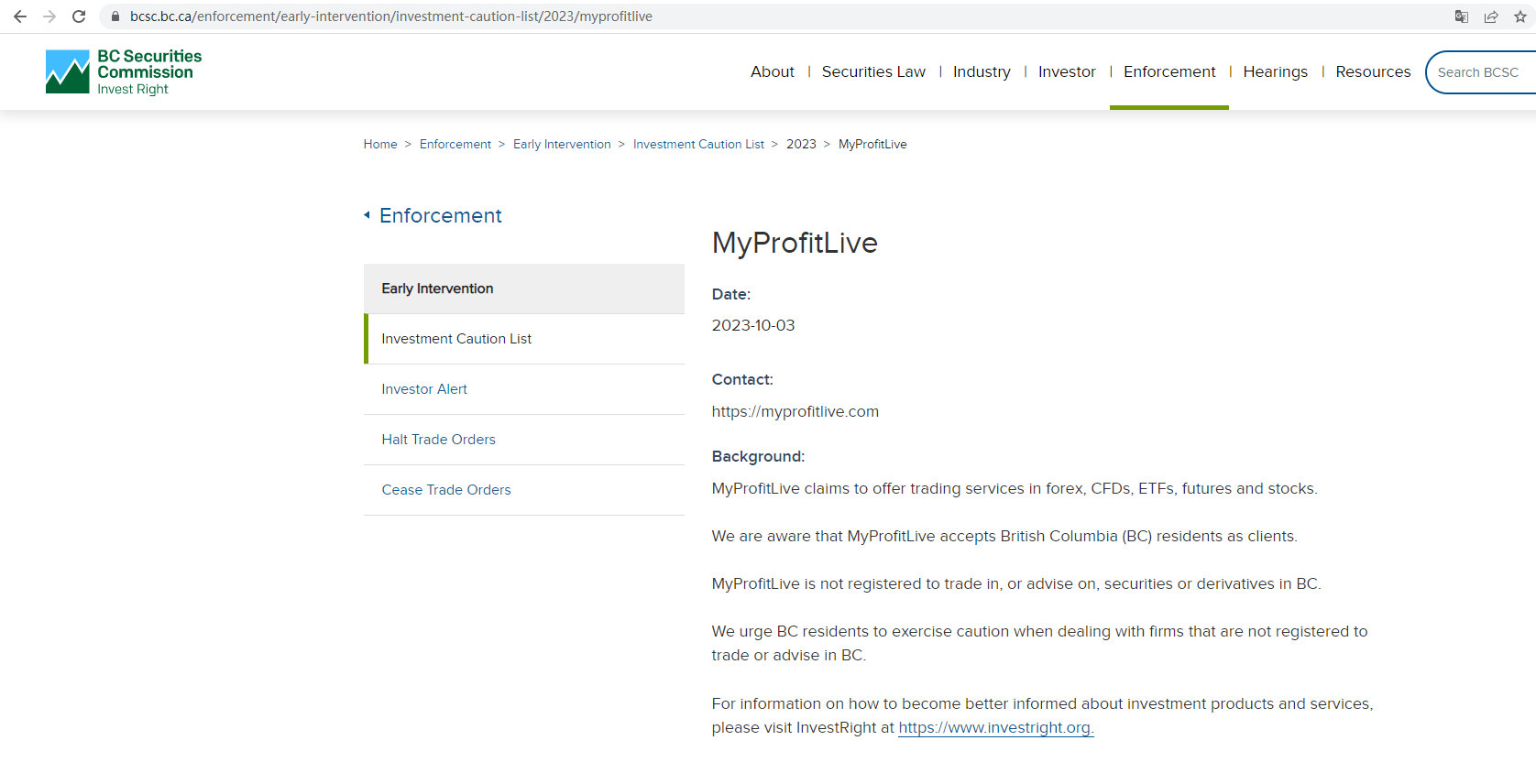 On 3 October 2023, the British Columbia Securities Commission (BCSC) issued a warning that MyProfitLive was providing financial services or products without authorisation. You may visit: https://www.bcsc.bc.ca/enforcement/early-intervention/investment-caution-list/2023/myprofitlive